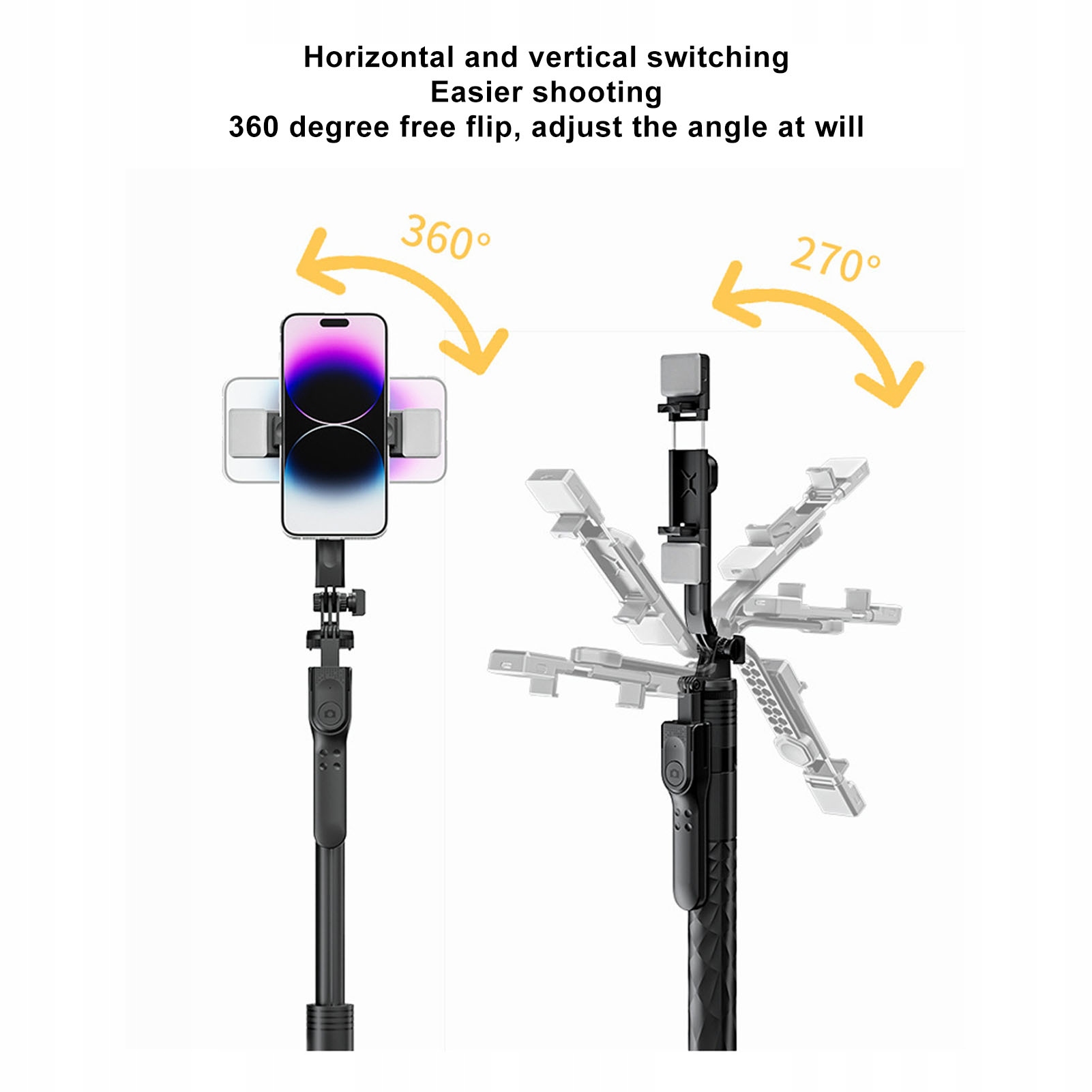 5. Два режима фотосъемки: когда штатив разложен, его можно использовать как устойчивое устройство для съемки на полу, когда штатив убран, его можно использовать в качестве палки для селфи и поддерживает максимальную телескопическую высоту 1,75 м, что подходит для всех видов съемочных ситуаций.