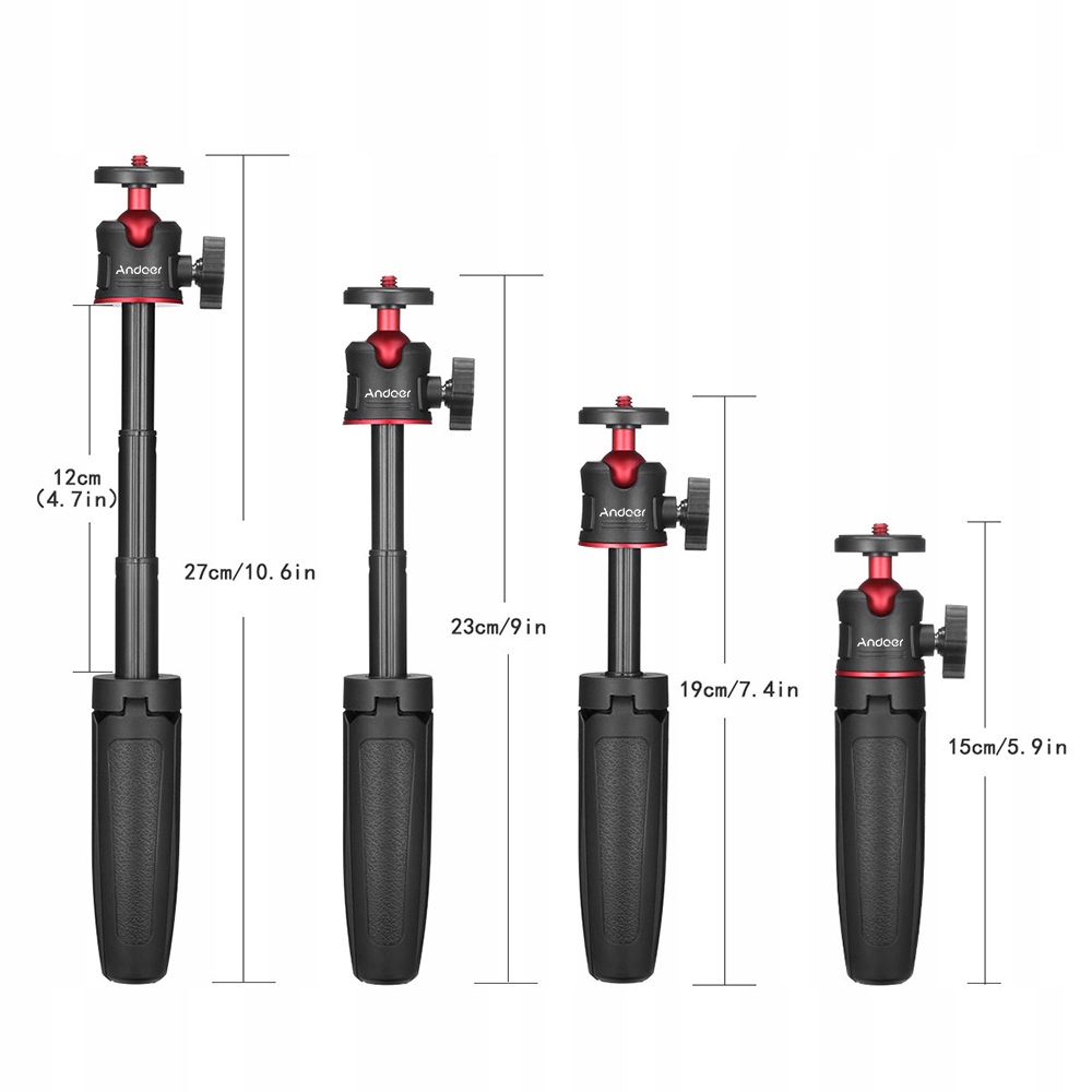 Стандартный 1/4 дюйма Винтовое крепление: Стандартное пристегнуть 1/4 дюйма на 360 °, вы можете свободно отрегулировать угол съемки, очень удобный в использовании. Разделы телескопического стержня поддерживают до 27 см /10,6 дюйма от максимальной длины использования, что позволяет получить более широкий диапазон съемки. Чистый вес 92 г, очень легко носить