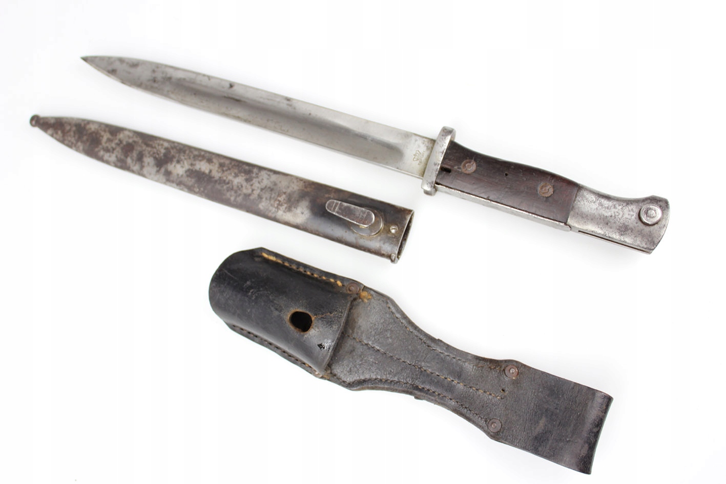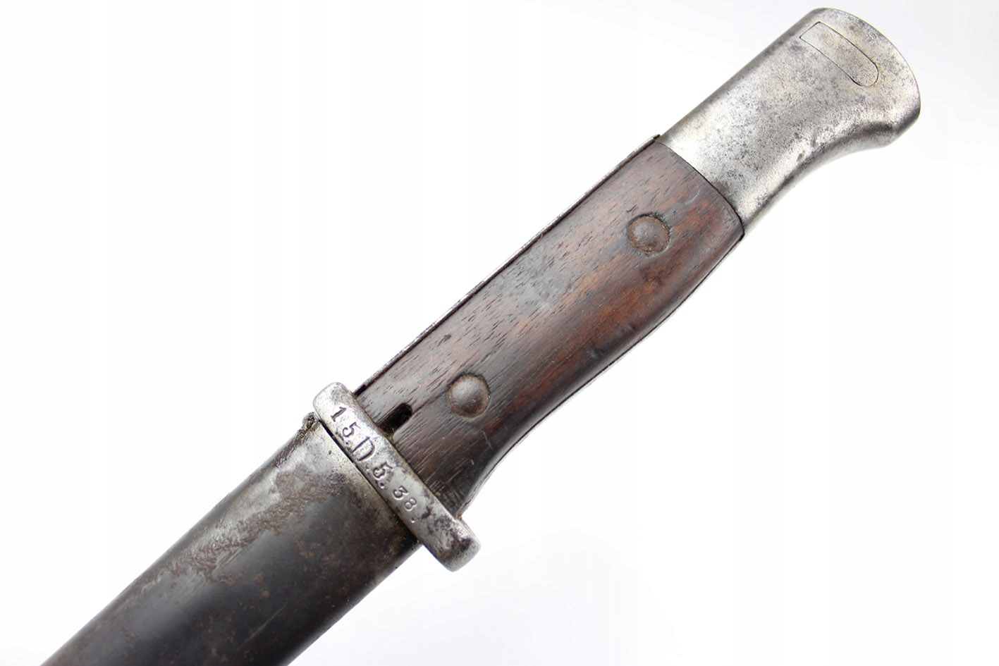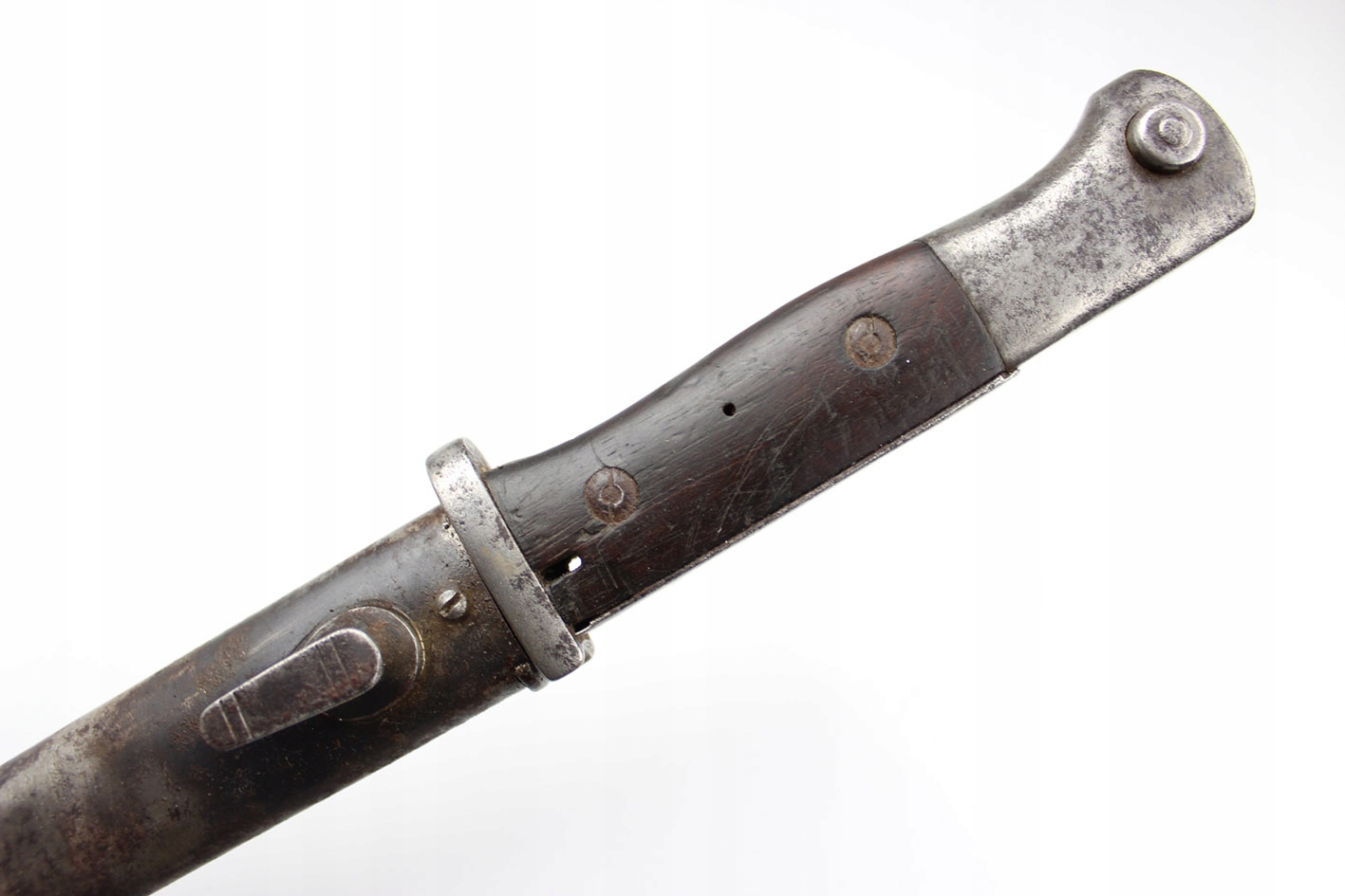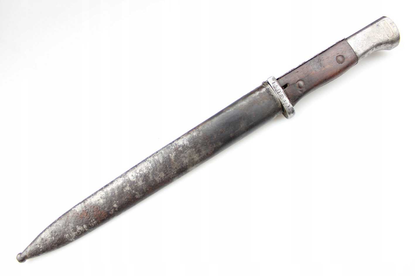 Образец прусского штыка Первой войны. С84/98 нового типа с противопожарной защитой. Аттический экземпляр в ножнах с сохранившейся лягушкой. Однолезвийный клинок с вогнутым долом с обеих сторон, с подписью на одной стороне: ЭРФУРТ (Kgl. Gewehr- und Munitionsfabrik, Эрфурт). На корешке под короной буква W (Вильгельм), дата 1915 г. до н.э. (также под короной) и прусская готическая буква. Лезвие не заточено. Стальная крестовина, подписанная аббревиатурой 15-го драгунского полка (3-й Силезии) (15.Д.5.38). Рукоять с рабочим замком и деревянными накладками с неповрежденными винтами без последующего вмешательства. Замок функциональный. Ножны стальные с частично сохранившимся оксидированием (под крестовиной). Остальная часть влагалища имеет нежную зернистость и ямки. Кожаная лягушка мягкая и гибкая, швы прочные, слегка потрескались возле отверстия для крепления крючка ножен. Точно как на фотографиях.