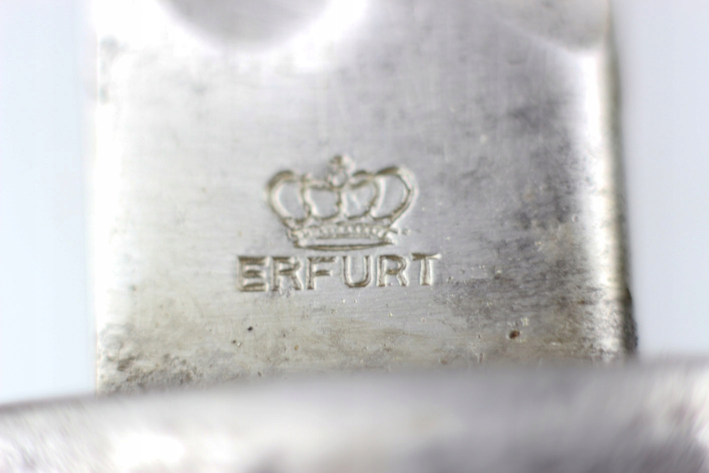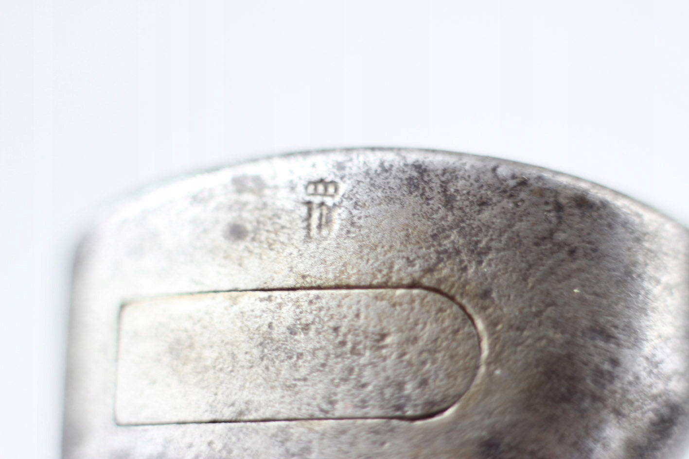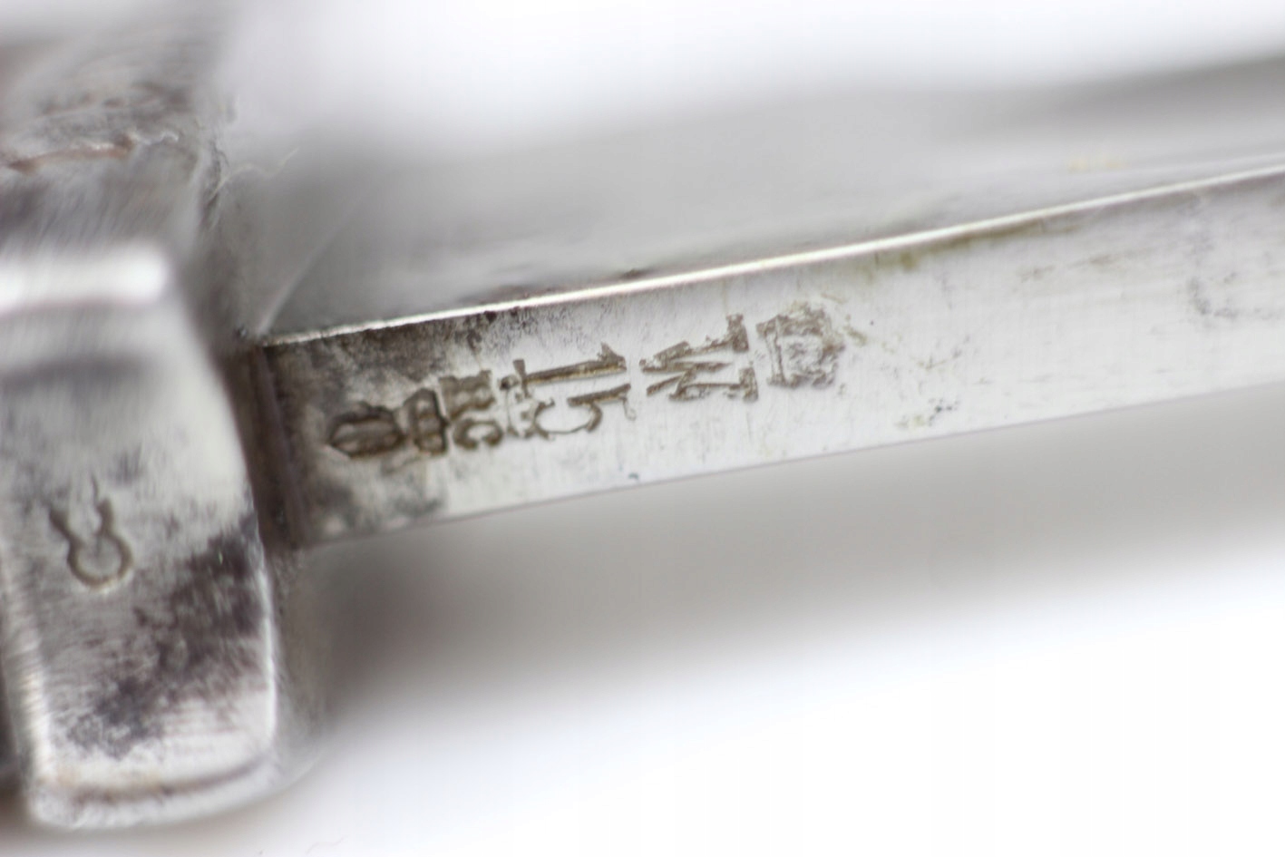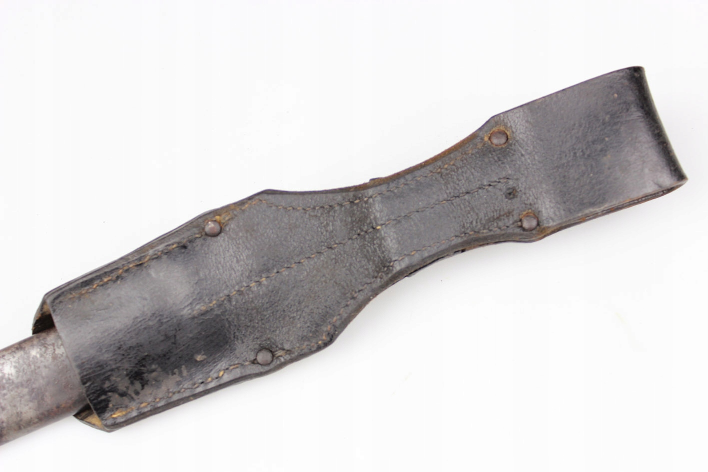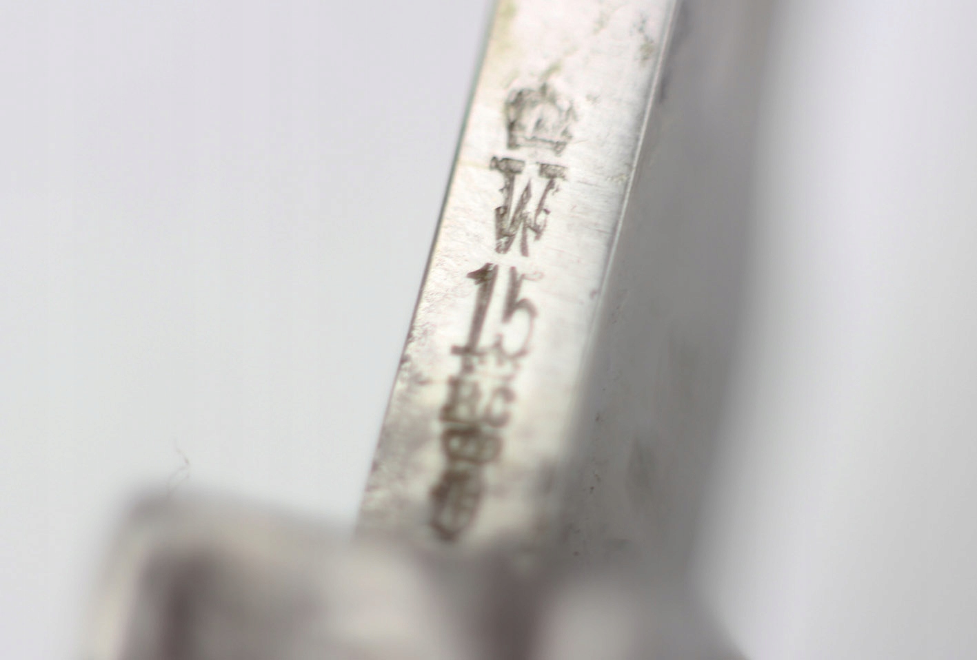 Образец прусского штыка Первой войны. С84/98 нового типа с противопожарной защитой. Аттический экземпляр в ножнах с сохранившейся лягушкой. Однолезвийный клинок с вогнутым долом с обеих сторон, с подписью на одной стороне: ЭРФУРТ (Kgl. Gewehr- und Munitionsfabrik, Эрфурт). На корешке под короной буква W (Вильгельм), дата 1915 г. до н.э. (также под короной) и прусская готическая буква. Лезвие не заточено. Стальная крестовина, подписанная аббревиатурой 15-го драгунского полка (3-й Силезии) (15.Д.5.38). Рукоять с рабочим замком и деревянными накладками с неповрежденными винтами без последующего вмешательства. Замок функциональный. Ножны стальные с частично сохранившимся оксидированием (под крестовиной). Остальная часть влагалища имеет нежную зернистость и ямки. Кожаная лягушка мягкая и гибкая, швы прочные, слегка потрескались возле отверстия для крепления крючка ножен. Точно как на фотографиях.