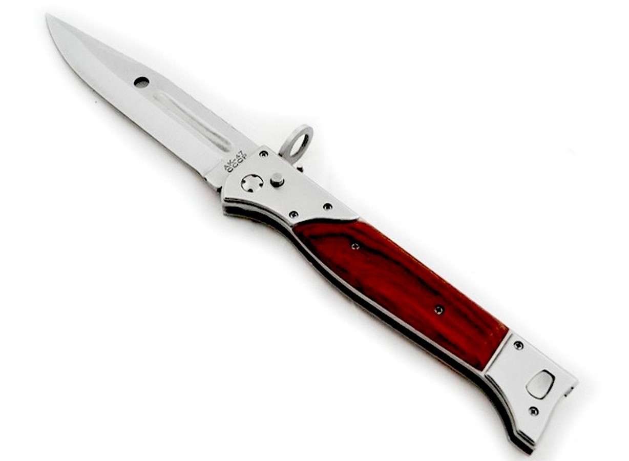 Выкидной нож АК-47 CCCP. Тяжелое, прочное лезвие из нержавеющей стали, деревянная подкладка. В комплект входит чехол, который можно прикрепить к ремню.