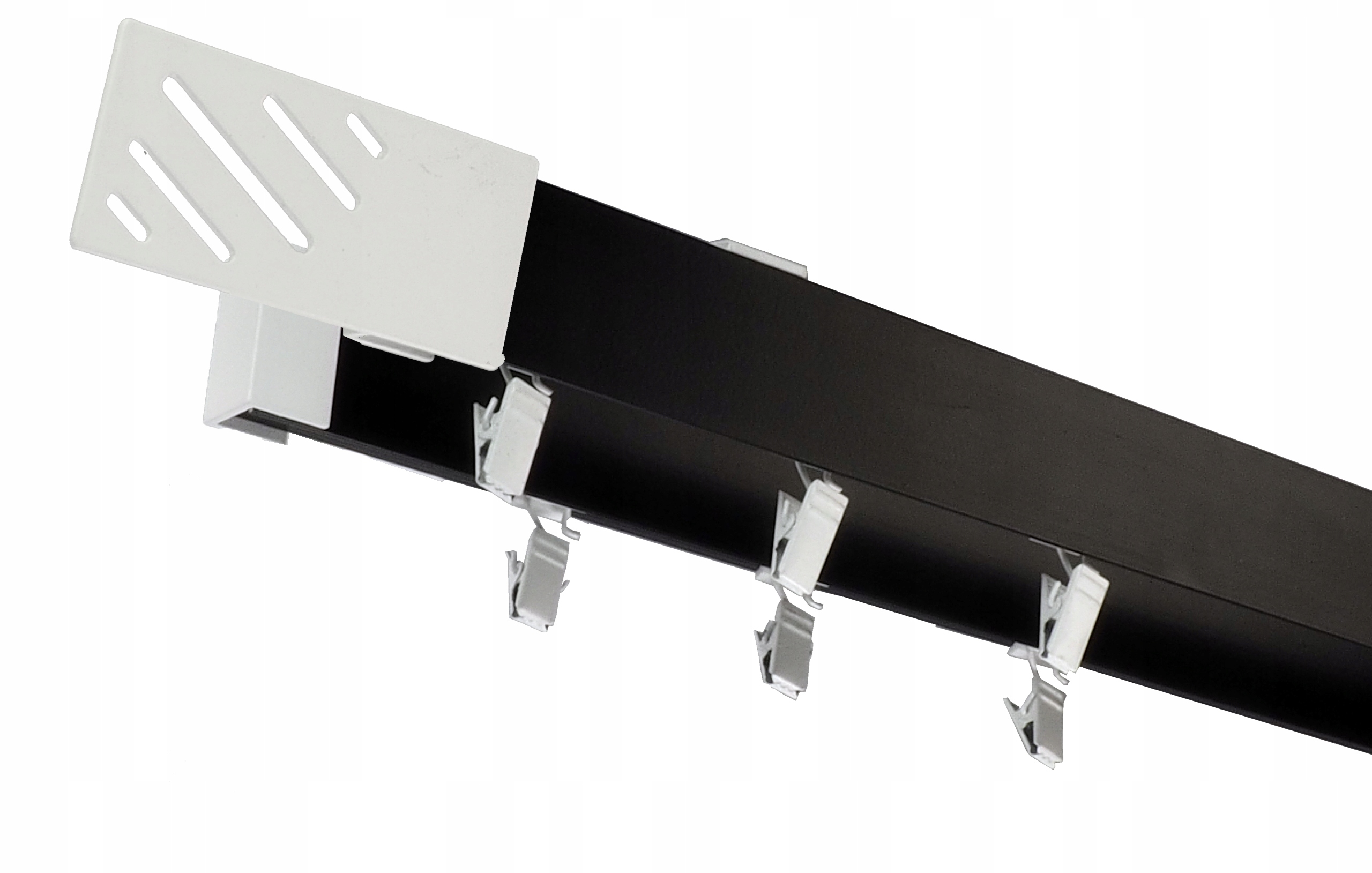Соединение кардинного стержня (в случае размеров выше 240 см) с использованием плоского профиля в верхнем канале, к которому прикреплен кронштейн. Слайки зажимы перемещаются по всей длине штор -стержня, не блокируя дополнительным кронштейном, как в случае стандартных штор.