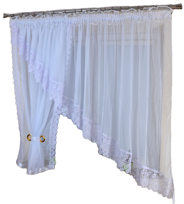- ламбрекен отделан красивым гипюром, внизу и вверху штора дополнительно отделана цветной атласной окантовкой в цвете, подходящем к узорной отделке ламбрекена.