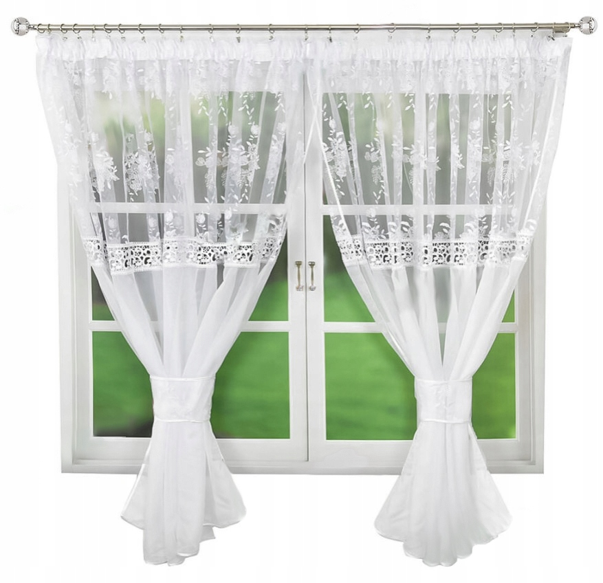 - Верхняя часть шторы украшена вышивкой с цветочным мотивом в сочетании с гипюровым кружевом.