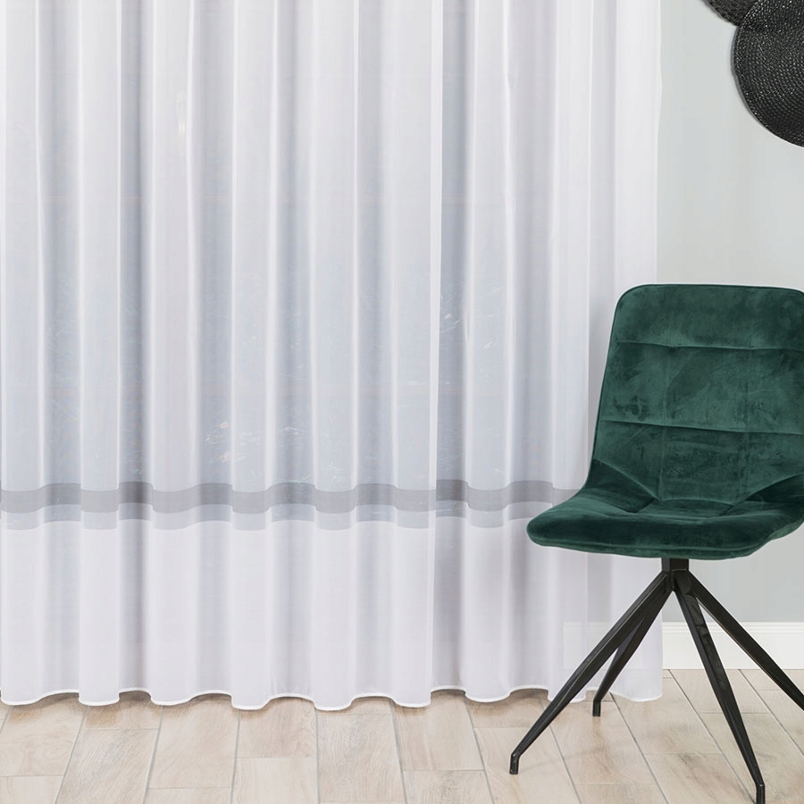 Классическая белоснежная жаккардовая штора с нежной сетчатой структурой с более толстой белой полосой и тонкой серой полосой внизу пропускает много света и красиво смотрится на окне в любой комнате.