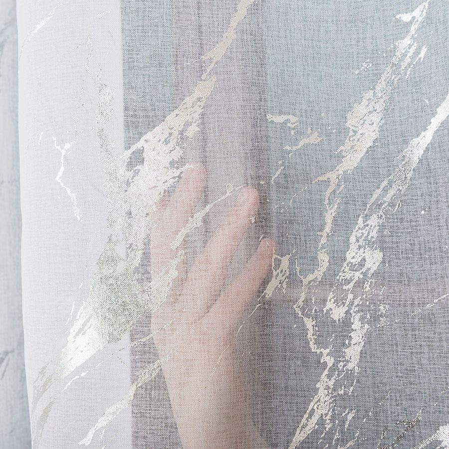 Белая штора из легкой и нежной ткани молочного цвета в стиле батиста, украшенная серебристым блестящим принтом имитирующий мрамор Занавес отделен эстетичным карнизом, который придает вес всему предмету и помогает ему идеально сидеть на окне. Материал не затемнит интерьер, но ограничит проникновение естественного солнечного света в помещение. Этот вневременной элемент дизайна будет хорошо смотреться в самых разных интерьерах, делая комнату больше и просторнее.