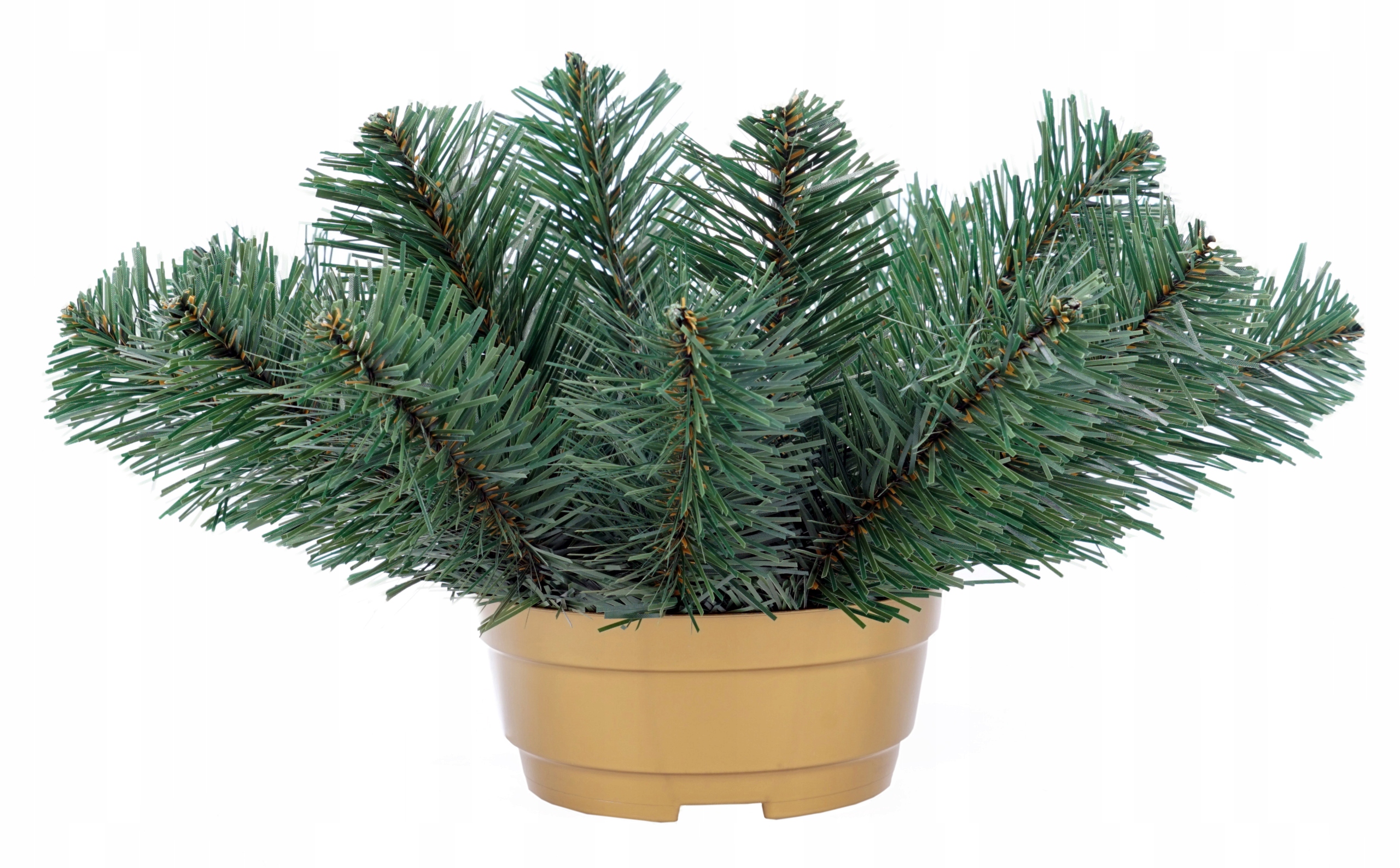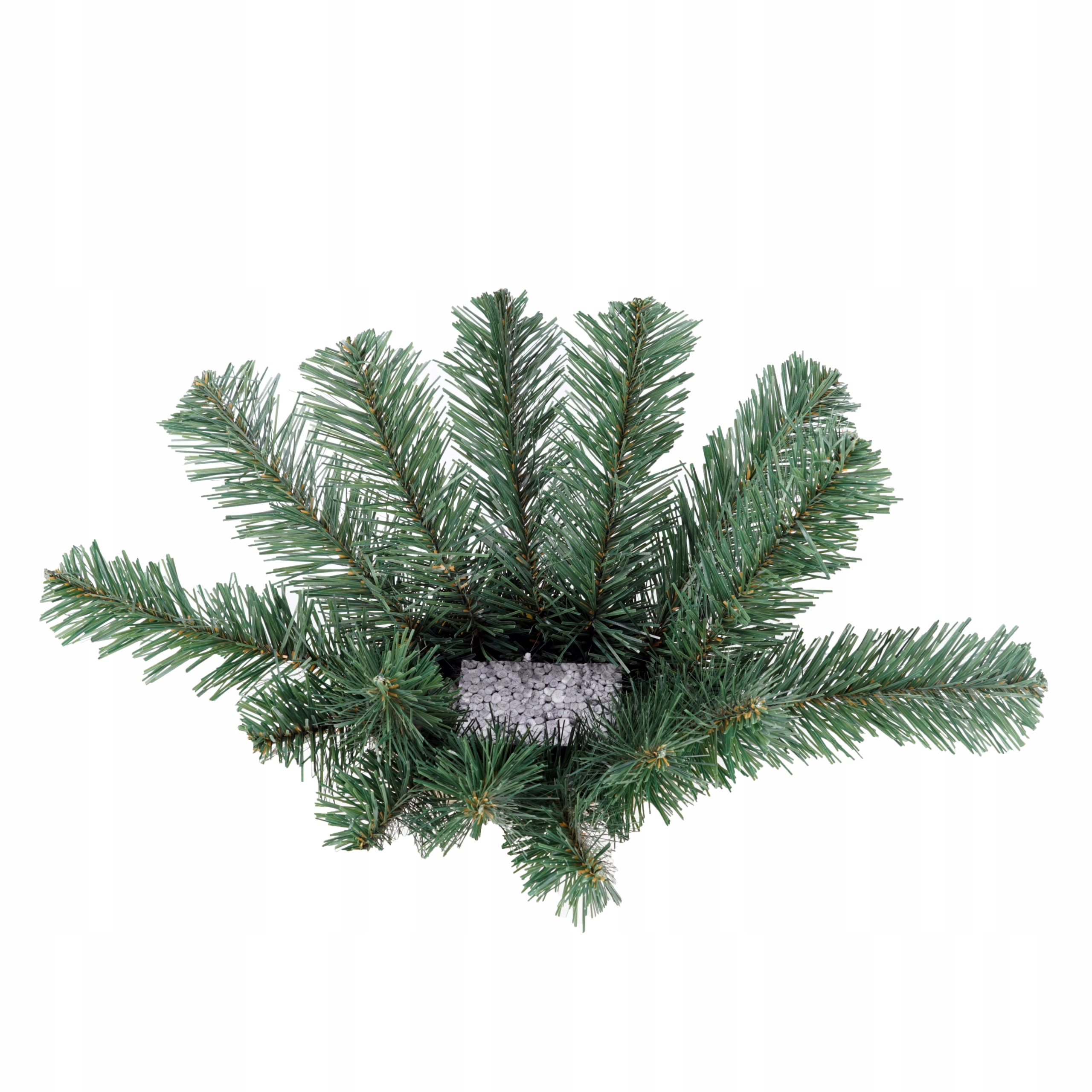 Искусственное основание из горшка, наполненного бетоном, на котором помещен кубик пенопласта. Зеленые хвойные веточки, изготовлены из ПВХ-пленки, польский продукт.