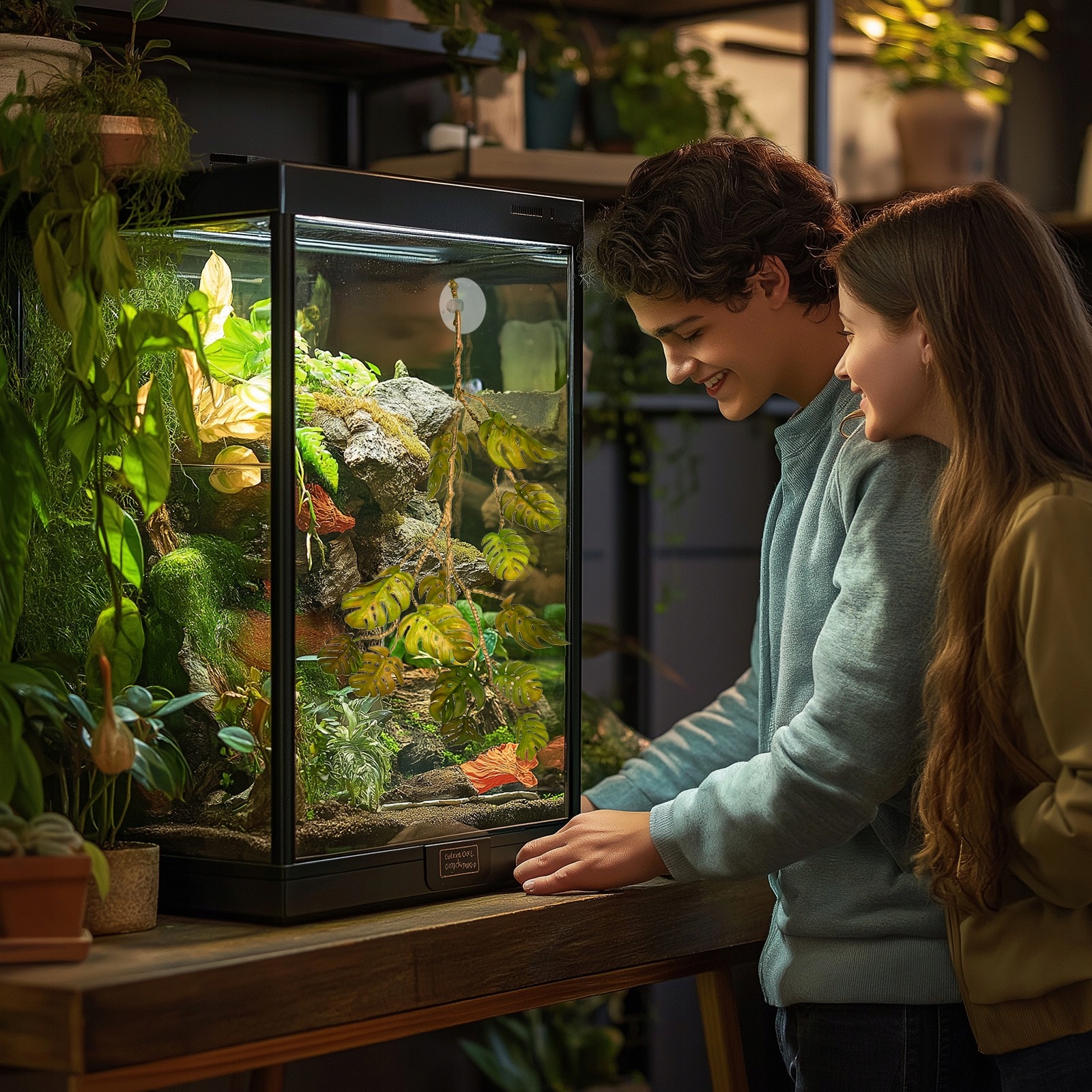 Искусственное растение Монстра, висящее на террариуме тропического аквариума 70 см.
