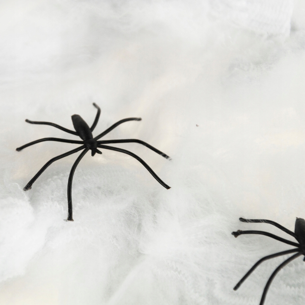 ✅ Белая паутина с четырьмя декоративными черными пауками, которые легко прикрепляются к материалу, усиливая декоративный эффект,