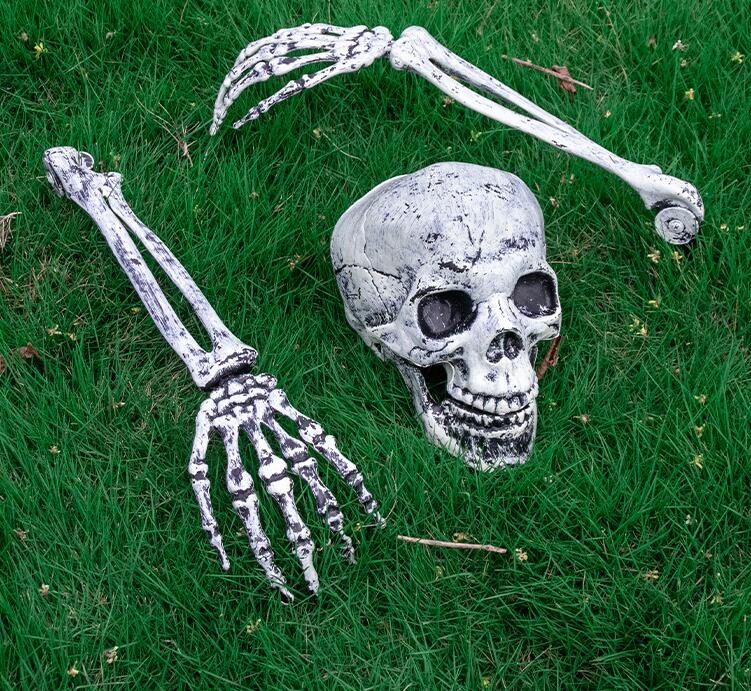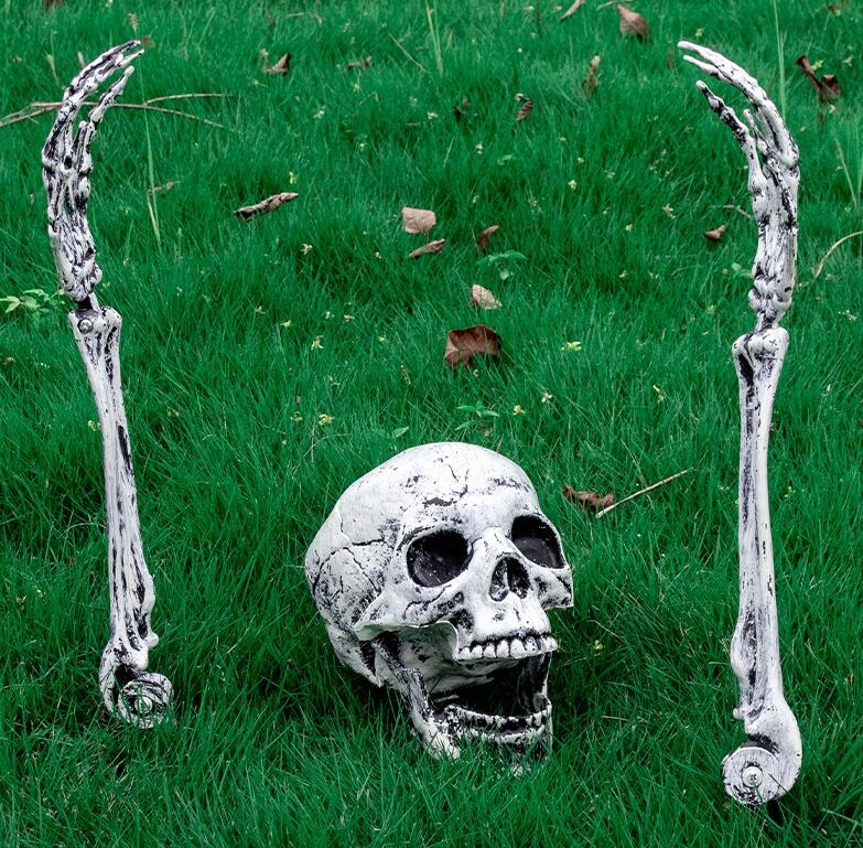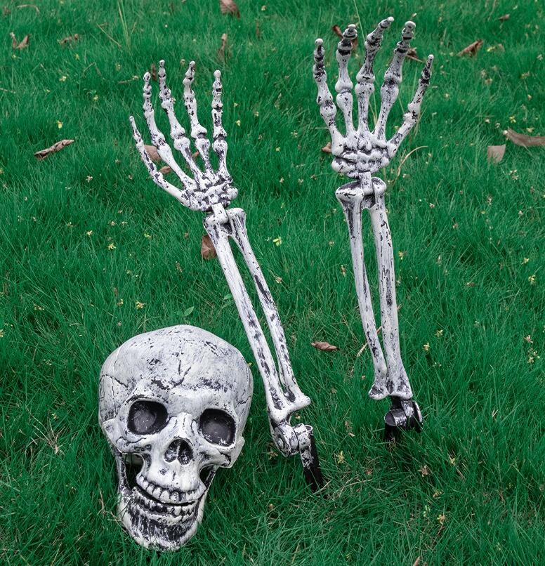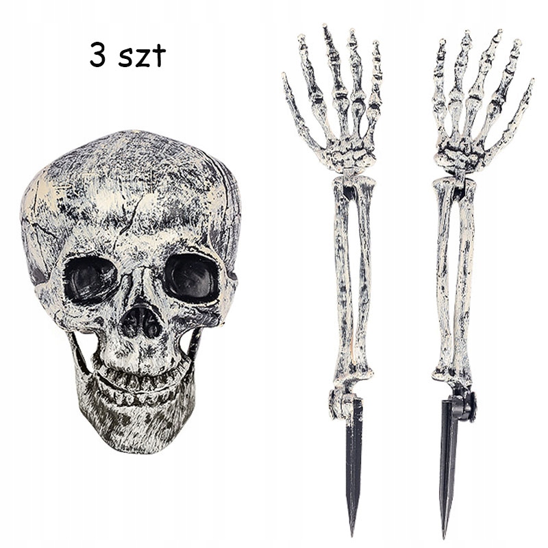 В комплект входят: 1 череп, две руки-скелетоны с пластиковыми стойками диаметром 12 см, длина каждой руки от нижней части колышка до кончиков пальцев составляет 47 см.