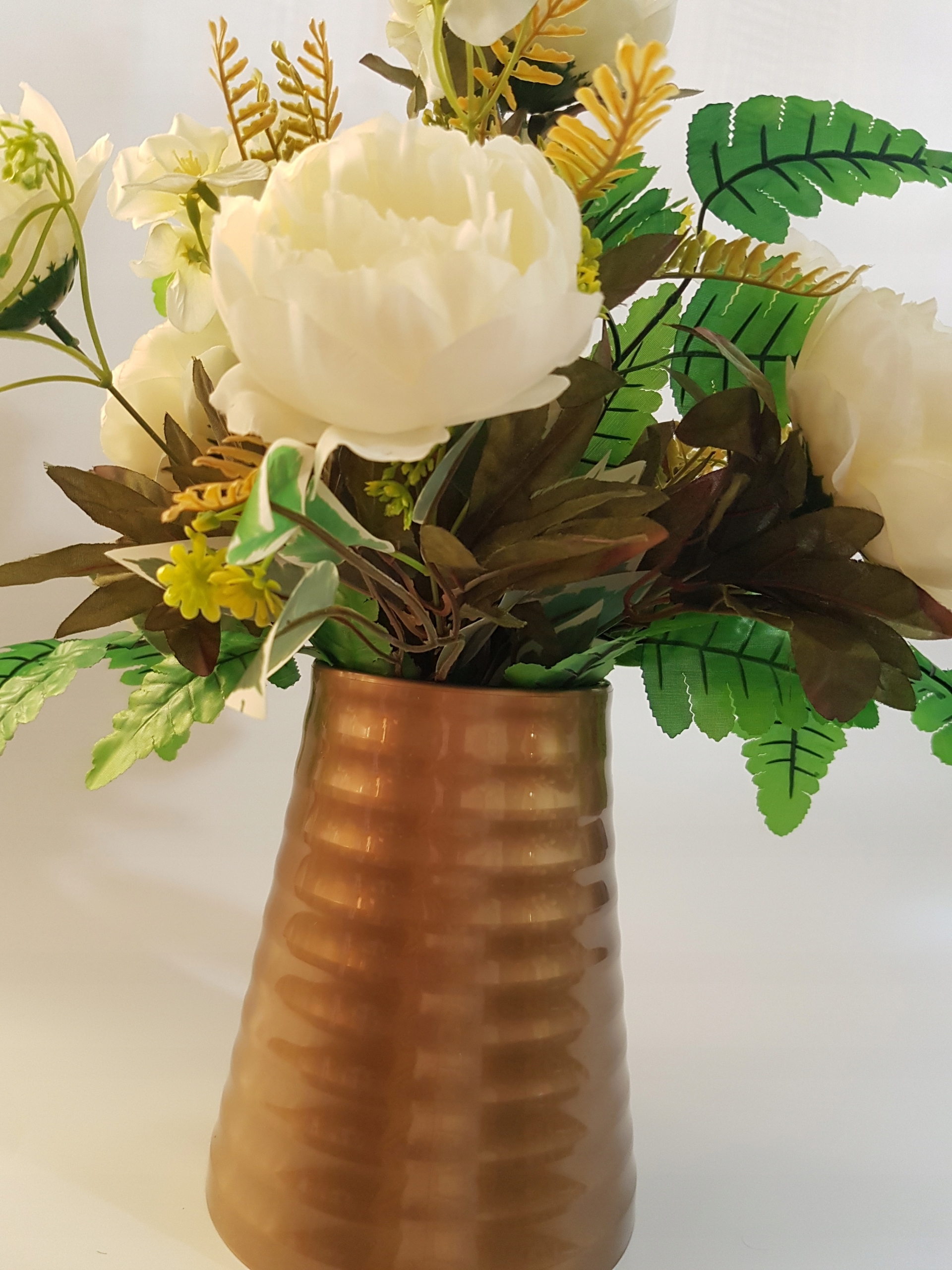 - в декоративном пластике золотистого цвета. горшок сцементированный и утяжеленный,
