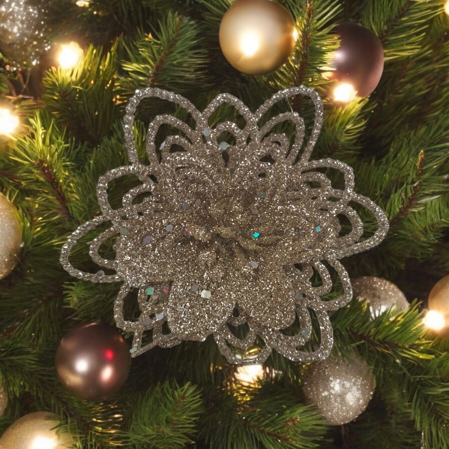 Рождественские цветы изготовлены из гибкого пластика и украшены блестками.
