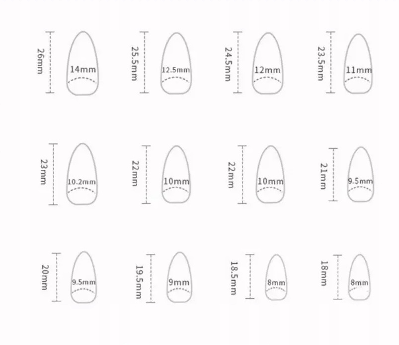В наборе разные размеры, поэтому вы сможете идеально подобрать искусственный ноготь к своей натуральной ногтевой пластине.