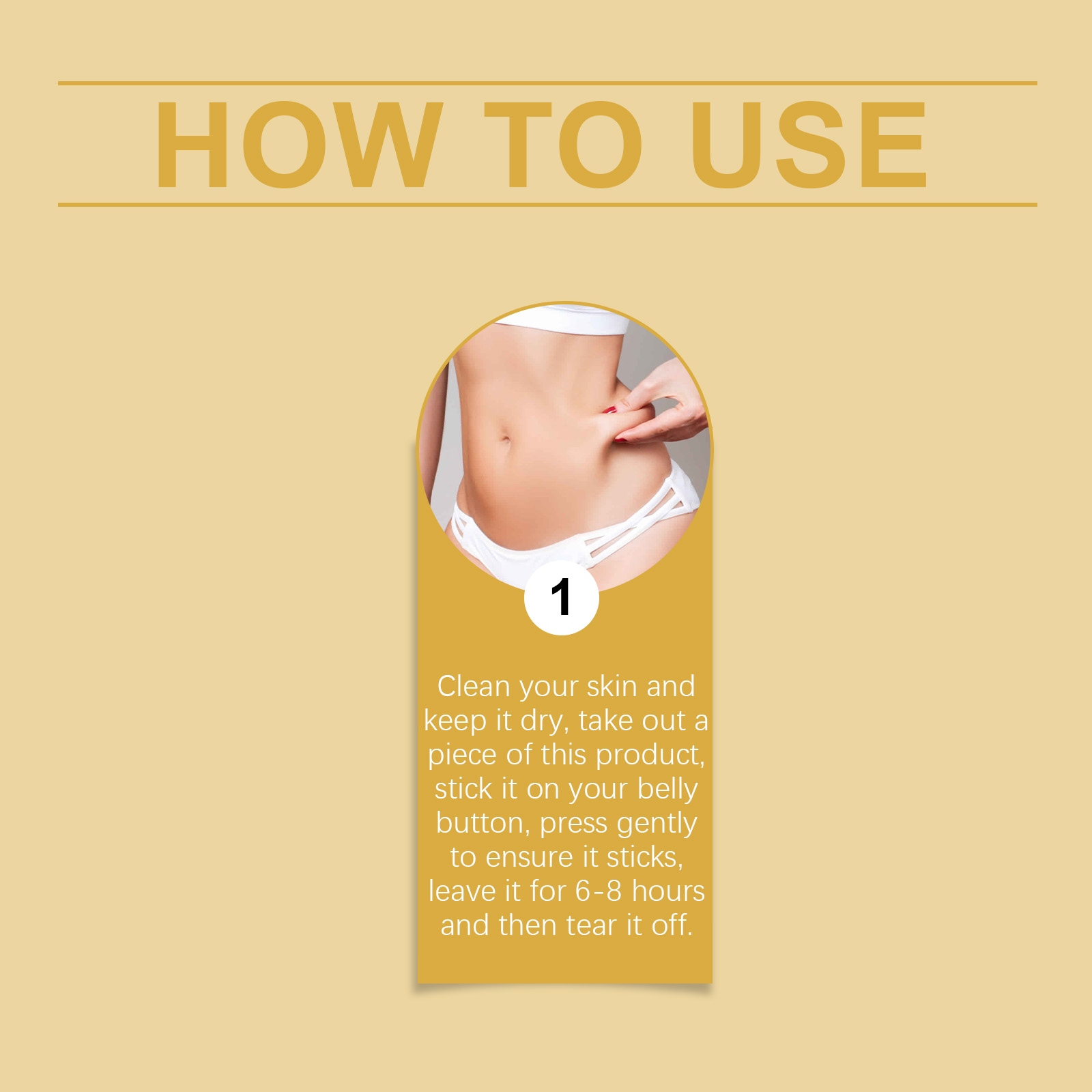 Метод нанесения прост: очистите кожу и сохраните ее сухой, удалите кусок этого продукта, приклейте его на пупок, аккуратно нажмите, чтобы обеспечить хорошую посадку, оставьте его зеленым в течение 6-8 часов и откапливайтесь.