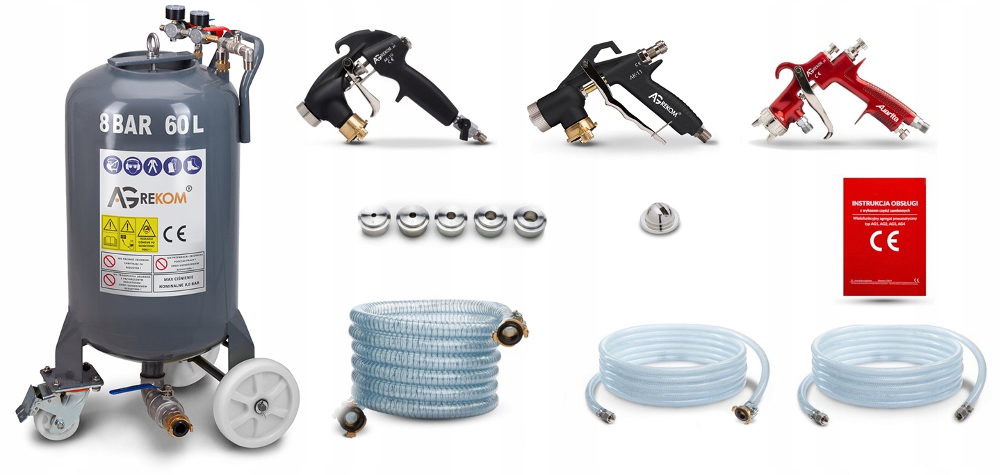 - 5 м армированный шланг со штуцерами для подключения воздуха к пистолетам,