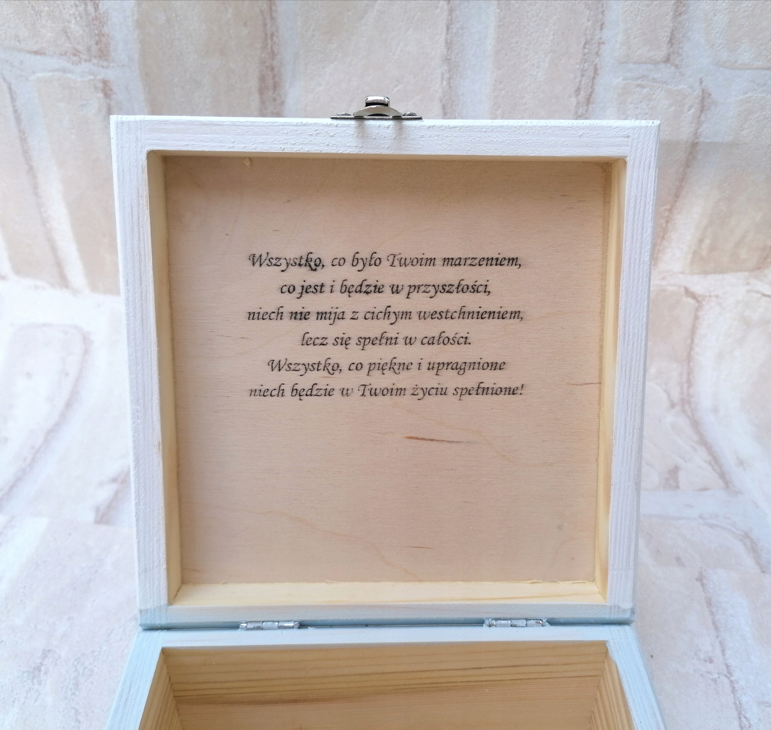 Я предлагаю трехпартийный набор, состоящий из коробки с размерами, 16x16 см, с возможностью любого посвящения/ имени в середине. p>
