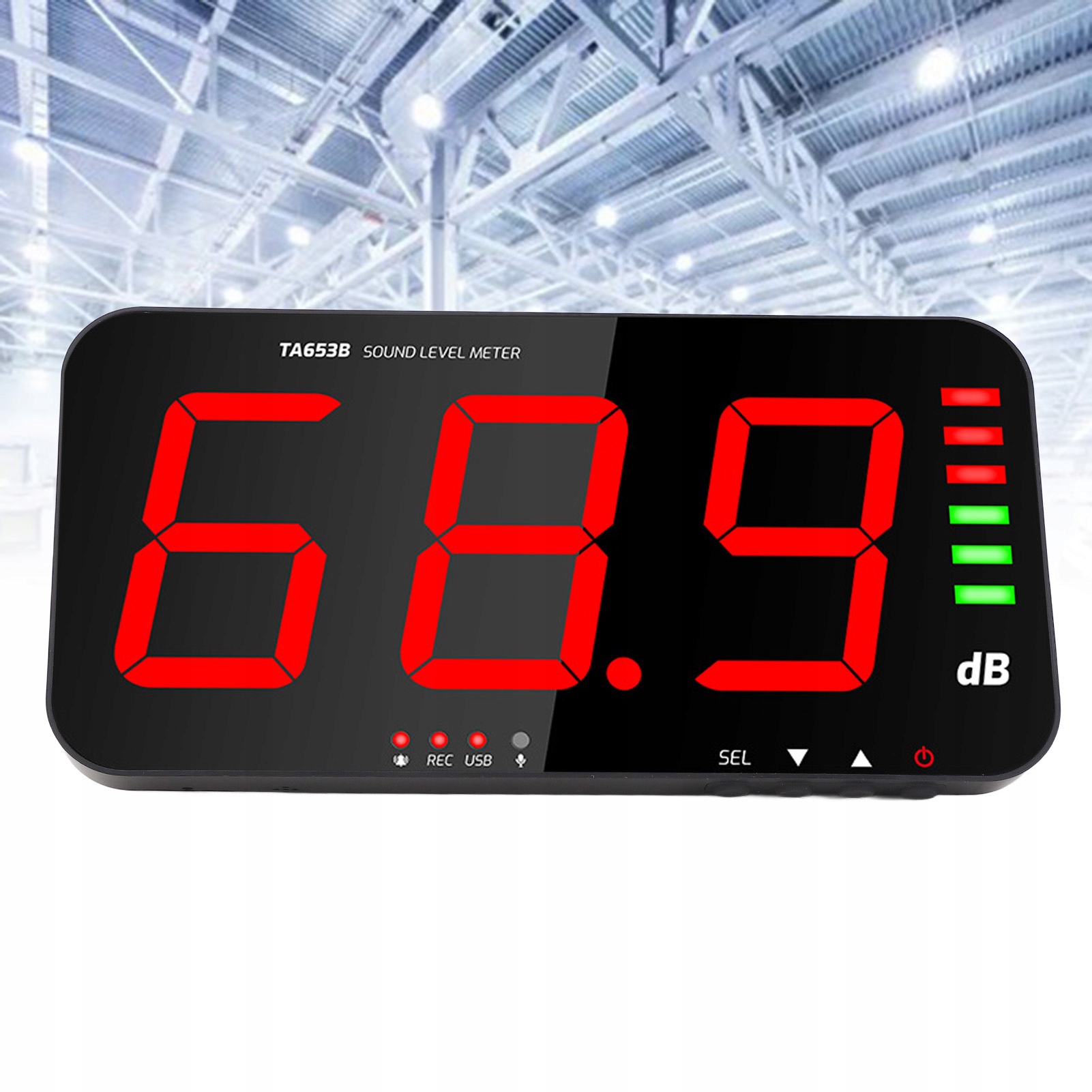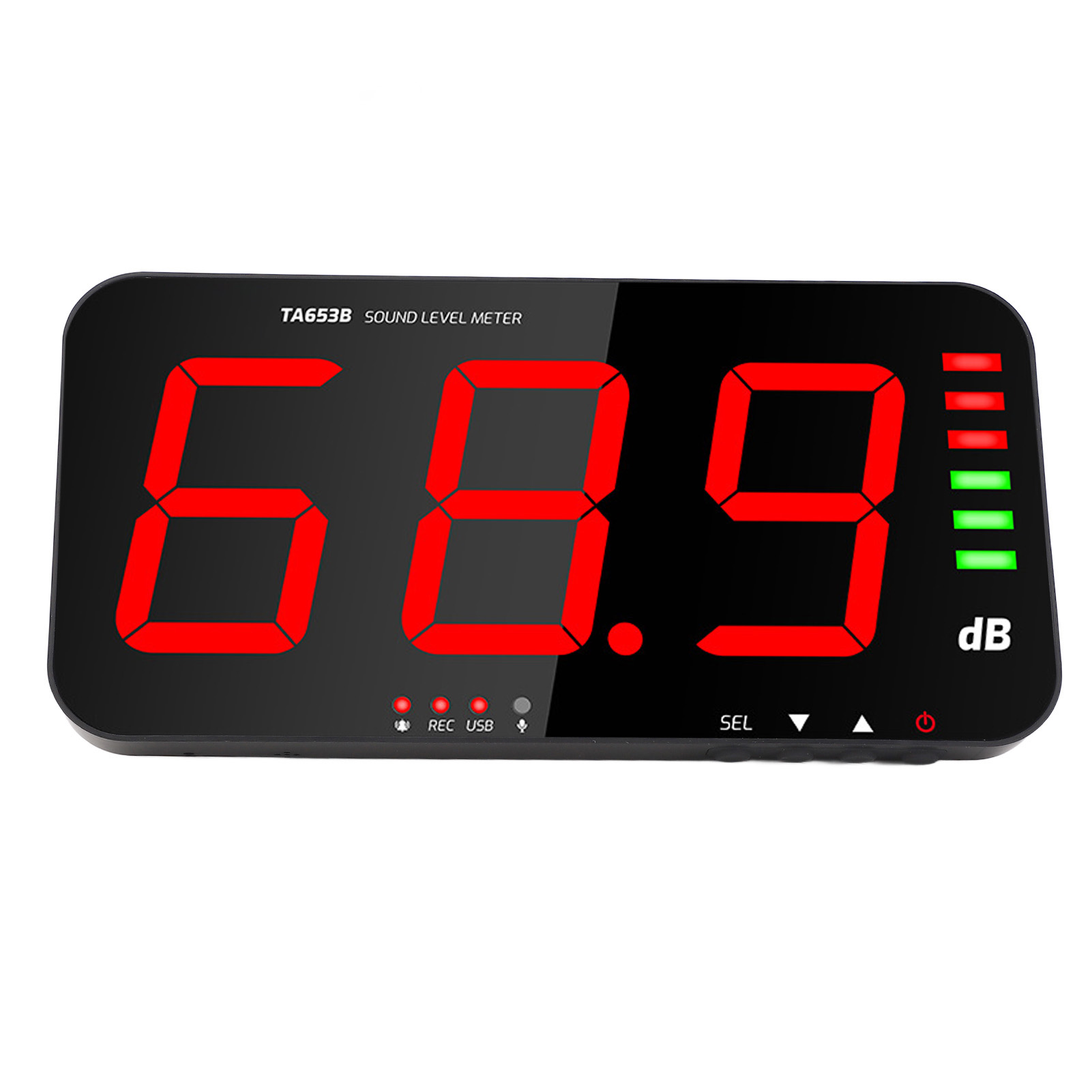 6. Индикатор уровня: Измеритель шума для настенного монтажа имеет аналоговую полоску индикатора уровня, шесть световых индикаторов: 30–75 дБ зеленого цвета, 76–130 дБ красного цвета, четко читаемые