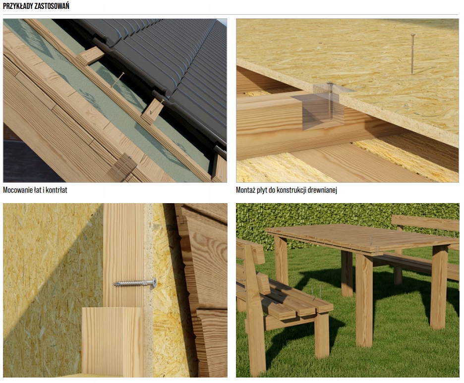 - Винты были изготовлены в соответствии со стандартом PN-EN 14592-2008 Этот европейский стандарт устанавливает требования и методы испытаний в отношении материалов, геометрии, прочность, жесткость и долговечность (т.е. защита от коррозии) соединителей, применяемых в несущих деревянных конструкциях