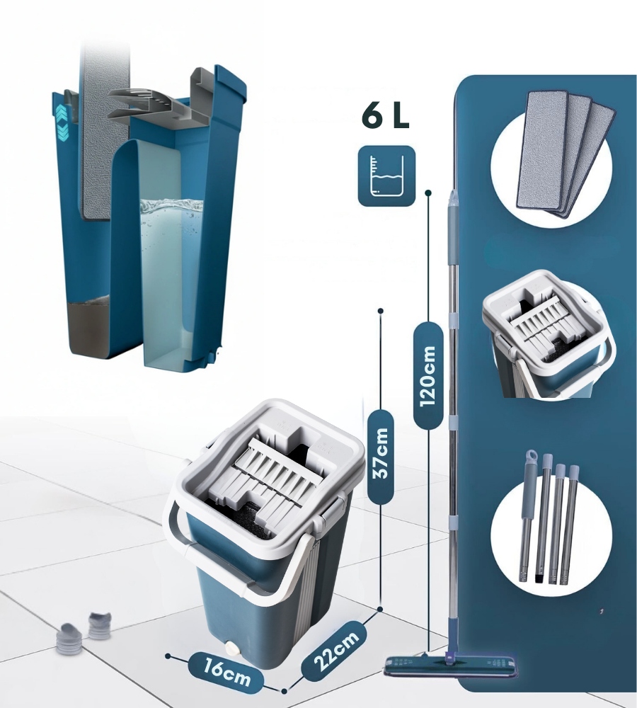 ПЛОСКАЯ ШВАБРА с двухкамерным ведром, 10 салфеток из микрофибры, синяя, 40 см