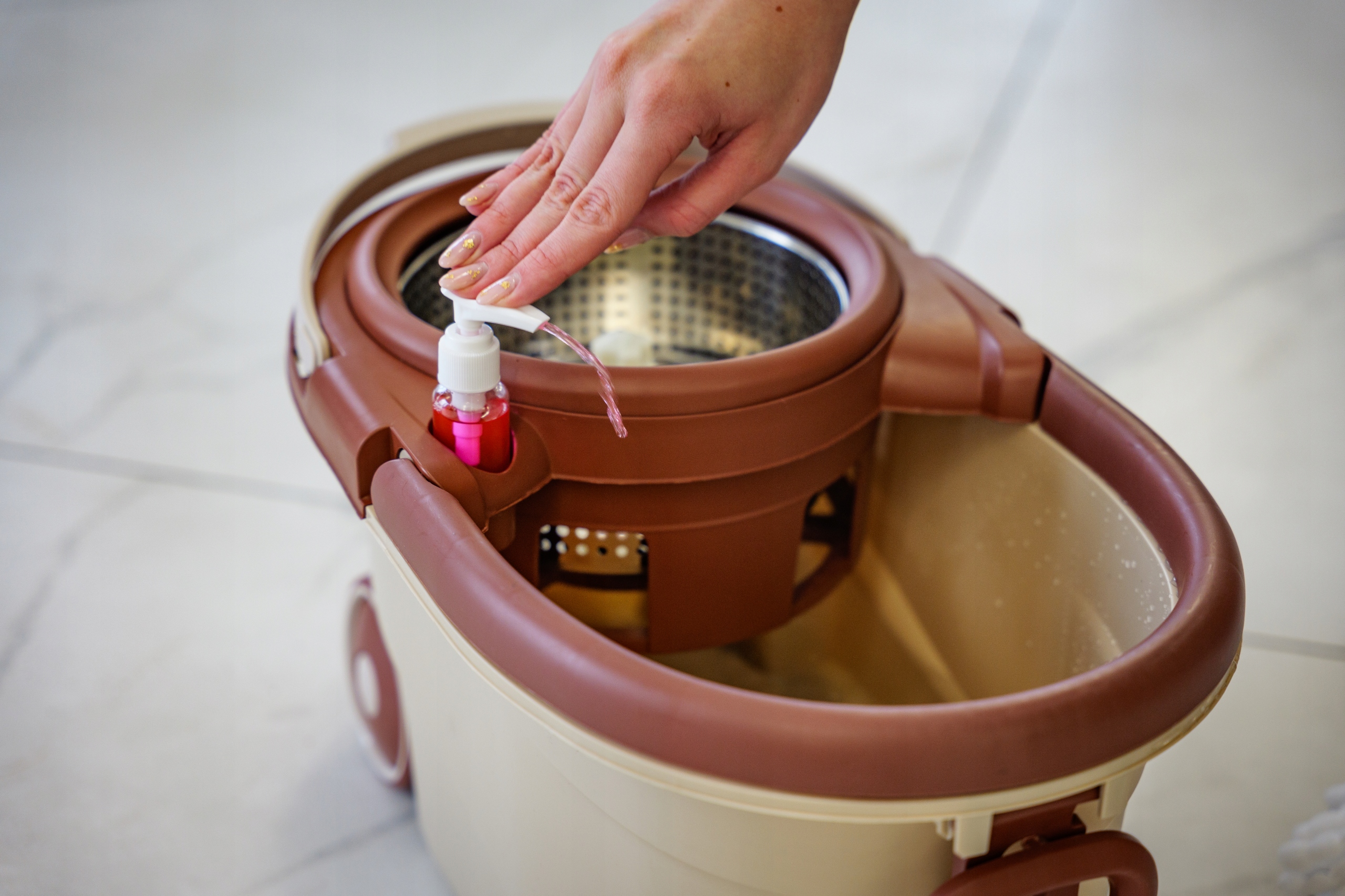 Ведро имеет систему слива воды, которая позволяет быстро и легко удалять лишнюю воду со швабры без использования рук. Вода выжимается из волокон, поэтому швабра остается влажной, что позволяет мыть полы без риска оставить разводы.