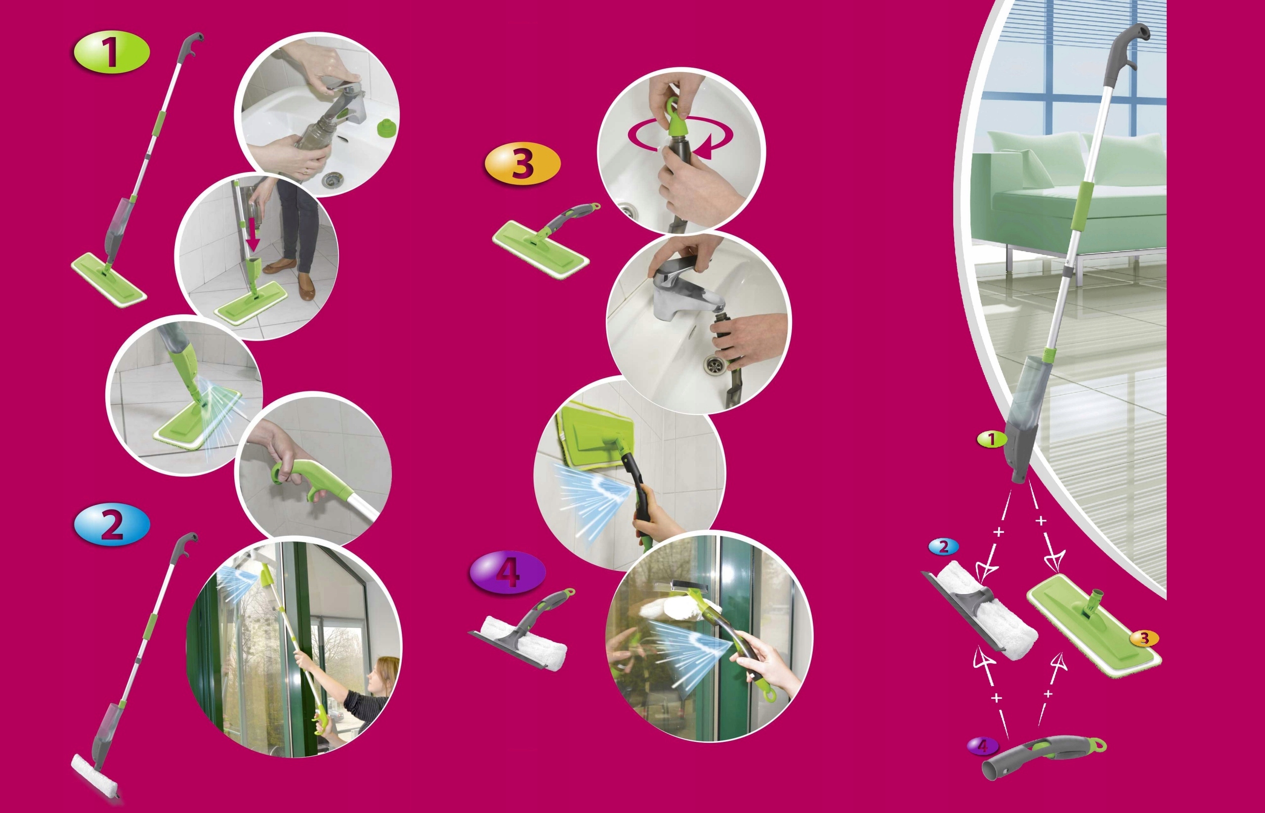 С его помощью можно мыть все типы полов, настенной плитки, а также окон и зеркал! Набор 4 в 1 — идеальное решение как для генеральной уборки, так и для повседневной уборки.