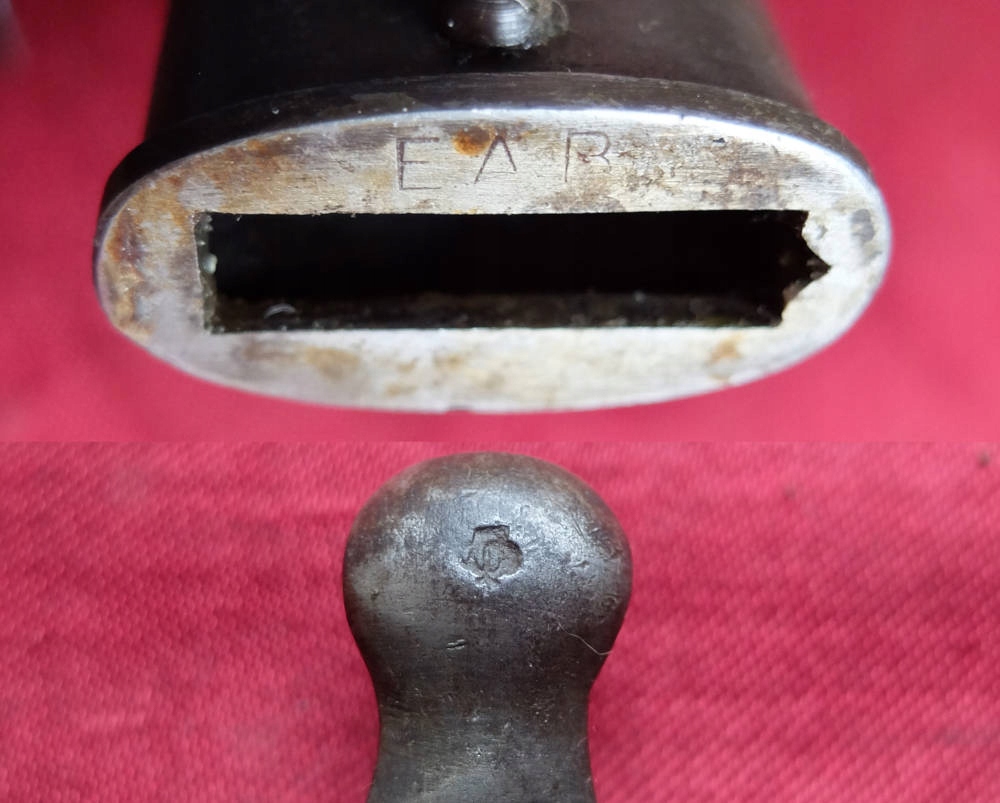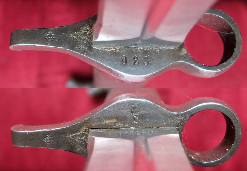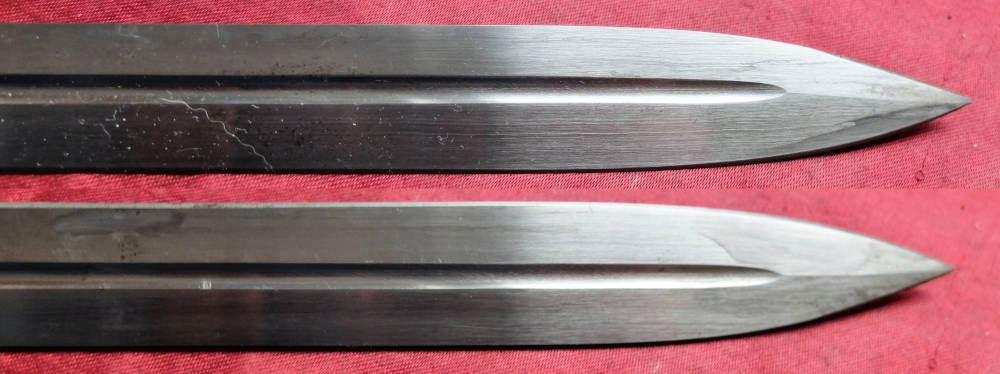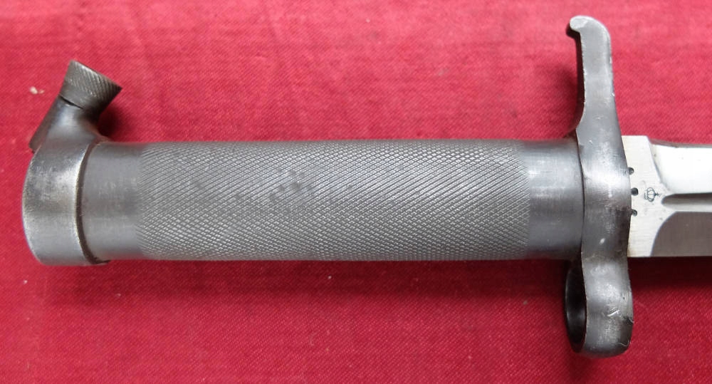 Клинок нешлифованный, заводская заточка. На краю лезвия видны подписи. Замок штыка рабочий.