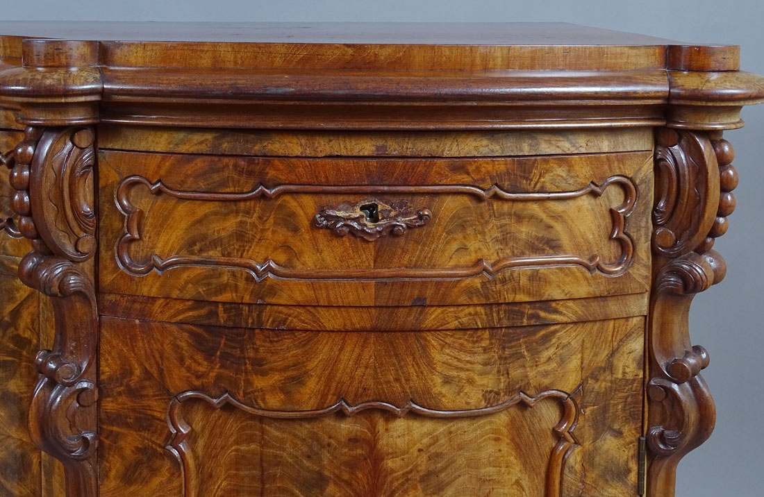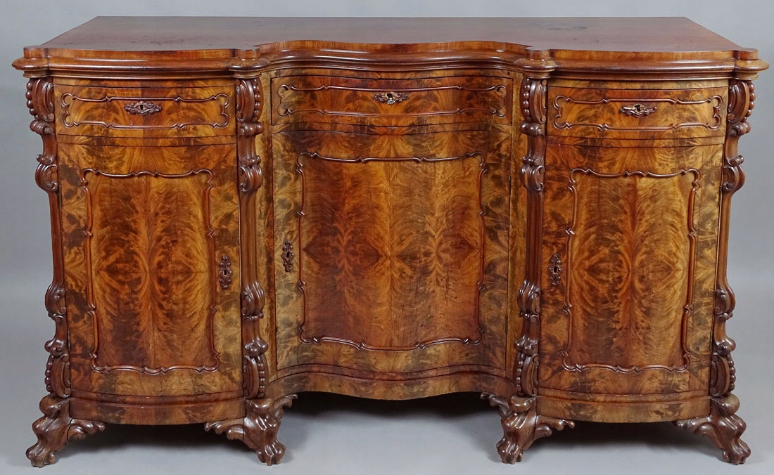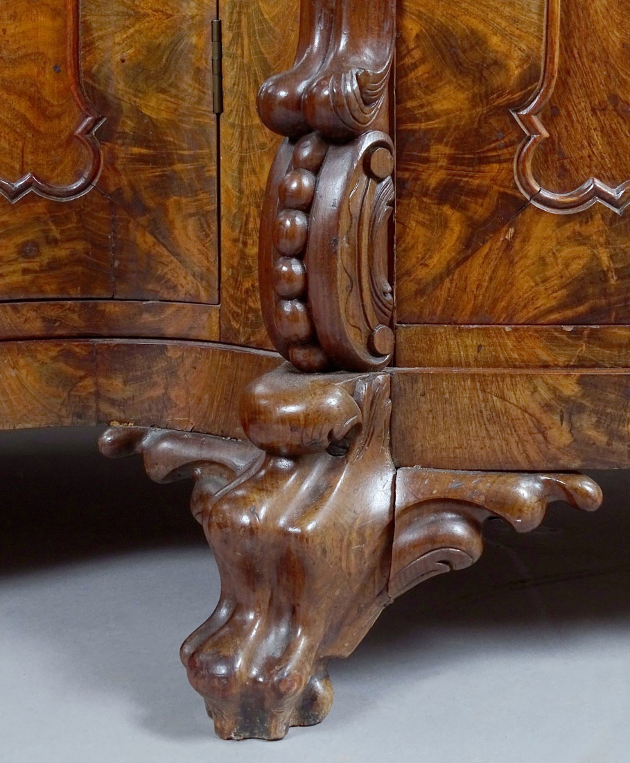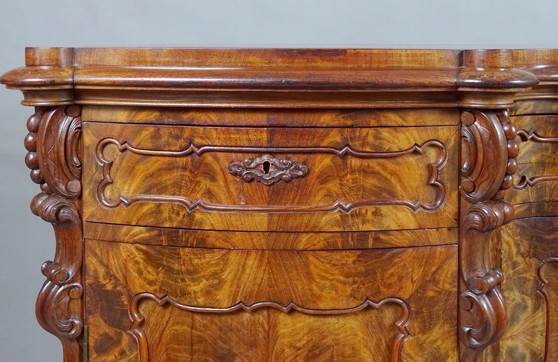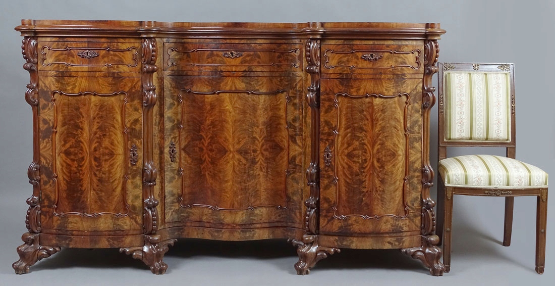 с прямыми сторонами и согнутыми спереди, закрытый тремя дверями, с тремя ящиками под столешницы. Поддерживается на шести ногах, четыре переднего резных, задний гребень. Боковые части буфета вперед и середина, снятые, лицо и ящики, включенные в профилированный резерв, с тонкой полосой по периметру, в каждой из них сталь, утопленных замков и ключа. Передний угол и две полосы посередине сильно вырезаны в виде листьев Acanthus, флористических дизайнов и тонких шариков, резервирование на дереве также на всех kluczyn. Массивный топ, форма, соответствующая мебельной структуре, слегка выступающая за пределы его контура, с прочной, профилированной полосой по бокам и спереди. Внутри три полки, частично выложенные материалом.