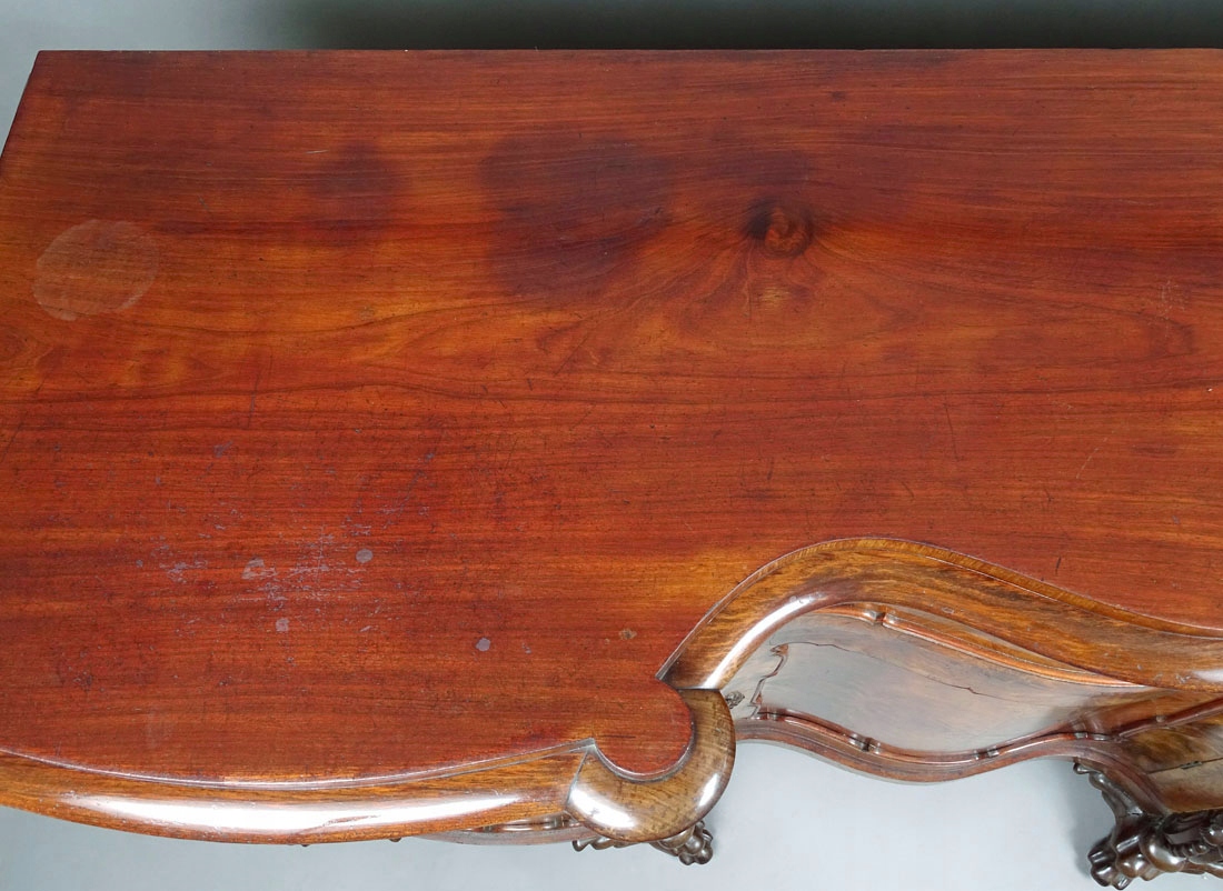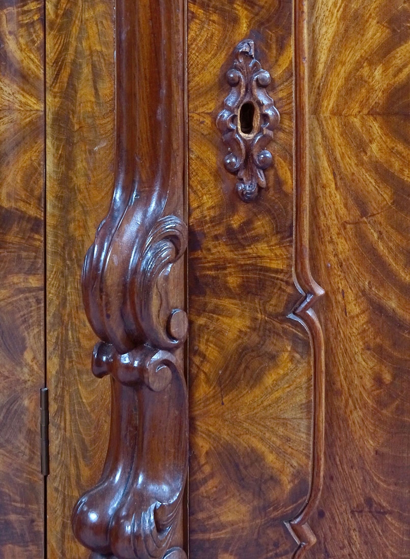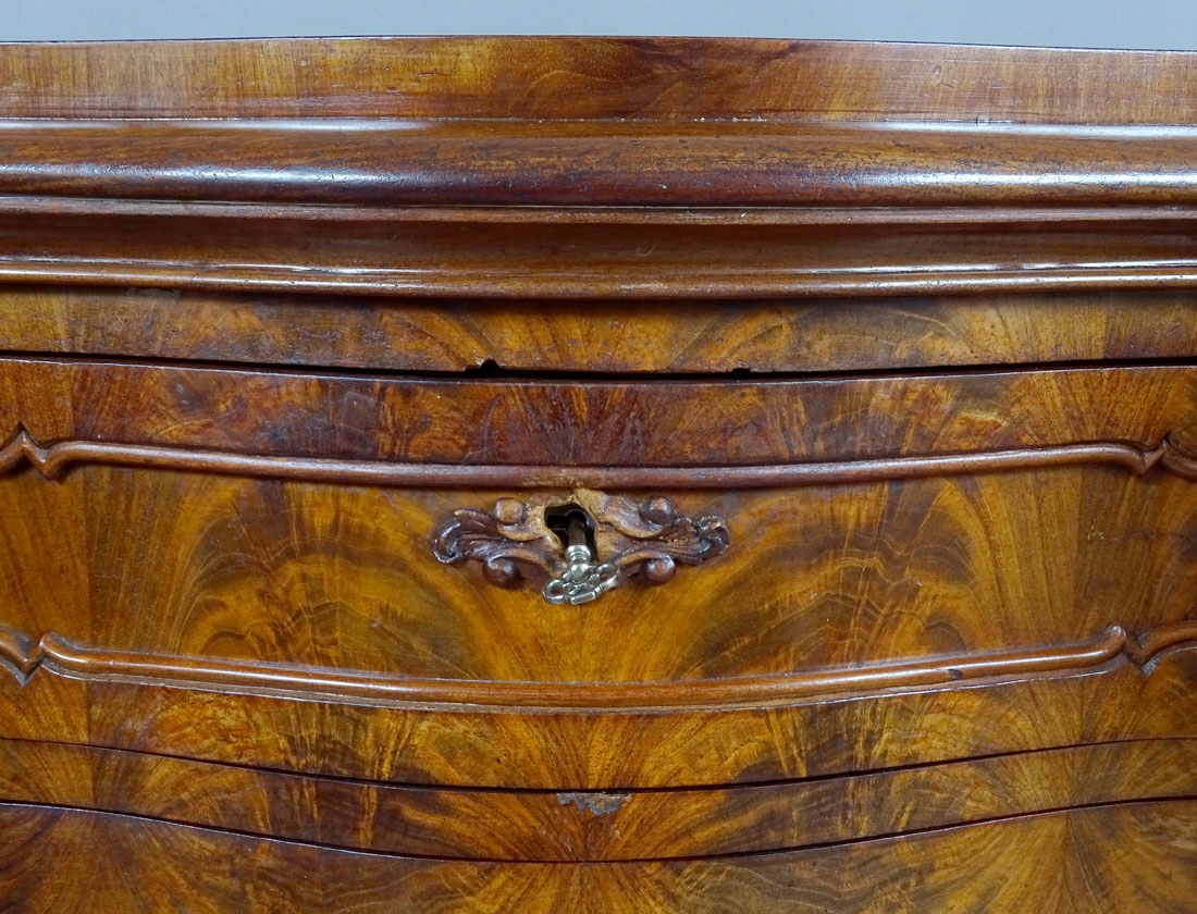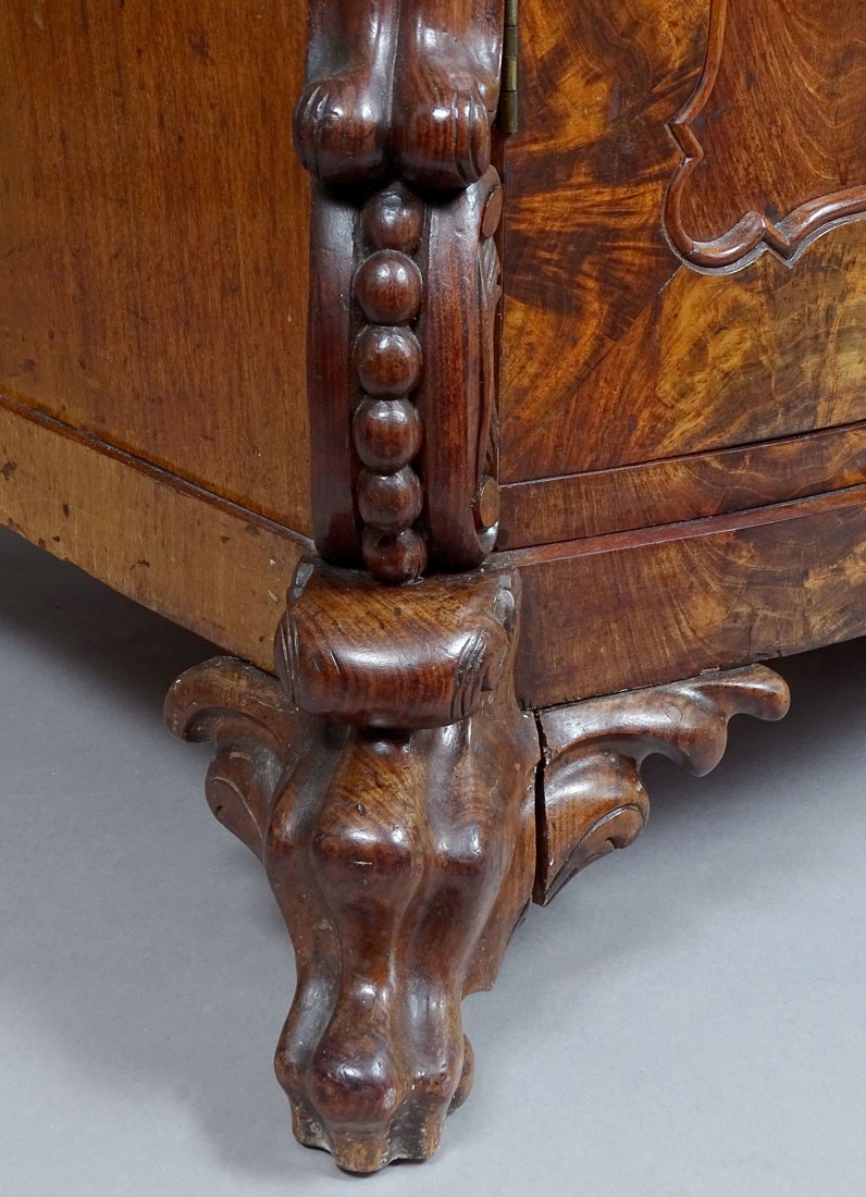с прямыми сторонами и согнутыми спереди, закрытый тремя дверями, с тремя ящиками под столешницы. Поддерживается на шести ногах, четыре переднего резных, задний гребень. Боковые части буфета вперед и середина, снятые, лицо и ящики, включенные в профилированный резерв, с тонкой полосой по периметру, в каждой из них сталь, утопленных замков и ключа. Передний угол и две полосы посередине сильно вырезаны в виде листьев Acanthus, флористических дизайнов и тонких шариков, резервирование на дереве также на всех kluczyn. Массивный топ, форма, соответствующая мебельной структуре, слегка выступающая за пределы его контура, с прочной, профилированной полосой по бокам и спереди. Внутри три полки, частично выложенные материалом.