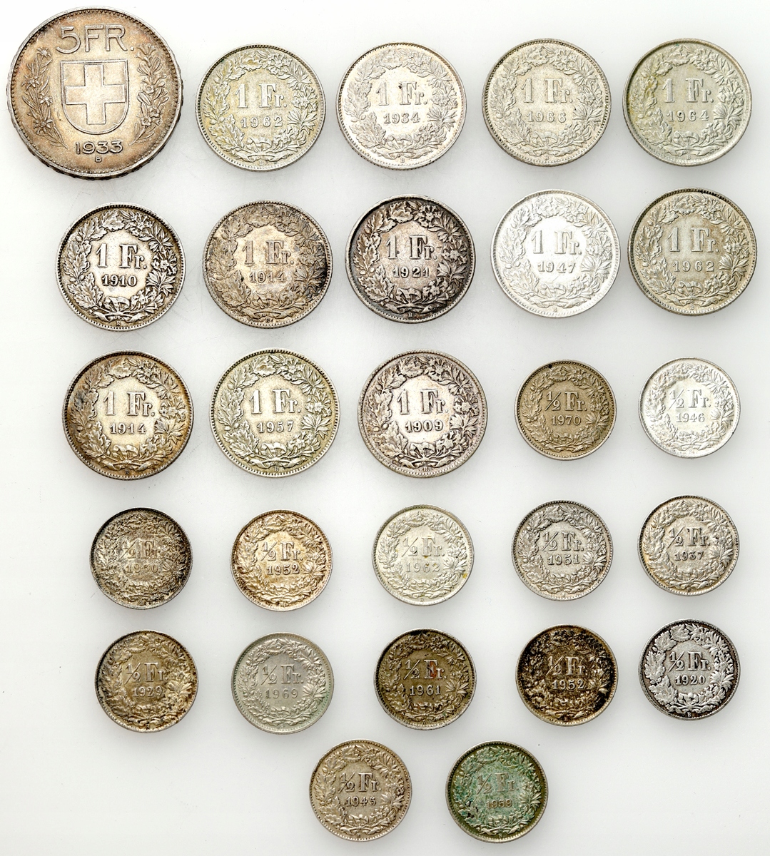 Швейцарія. Партія монет від 1/2 до 5 франків, різні дати - 27 штук - СРІБЛО