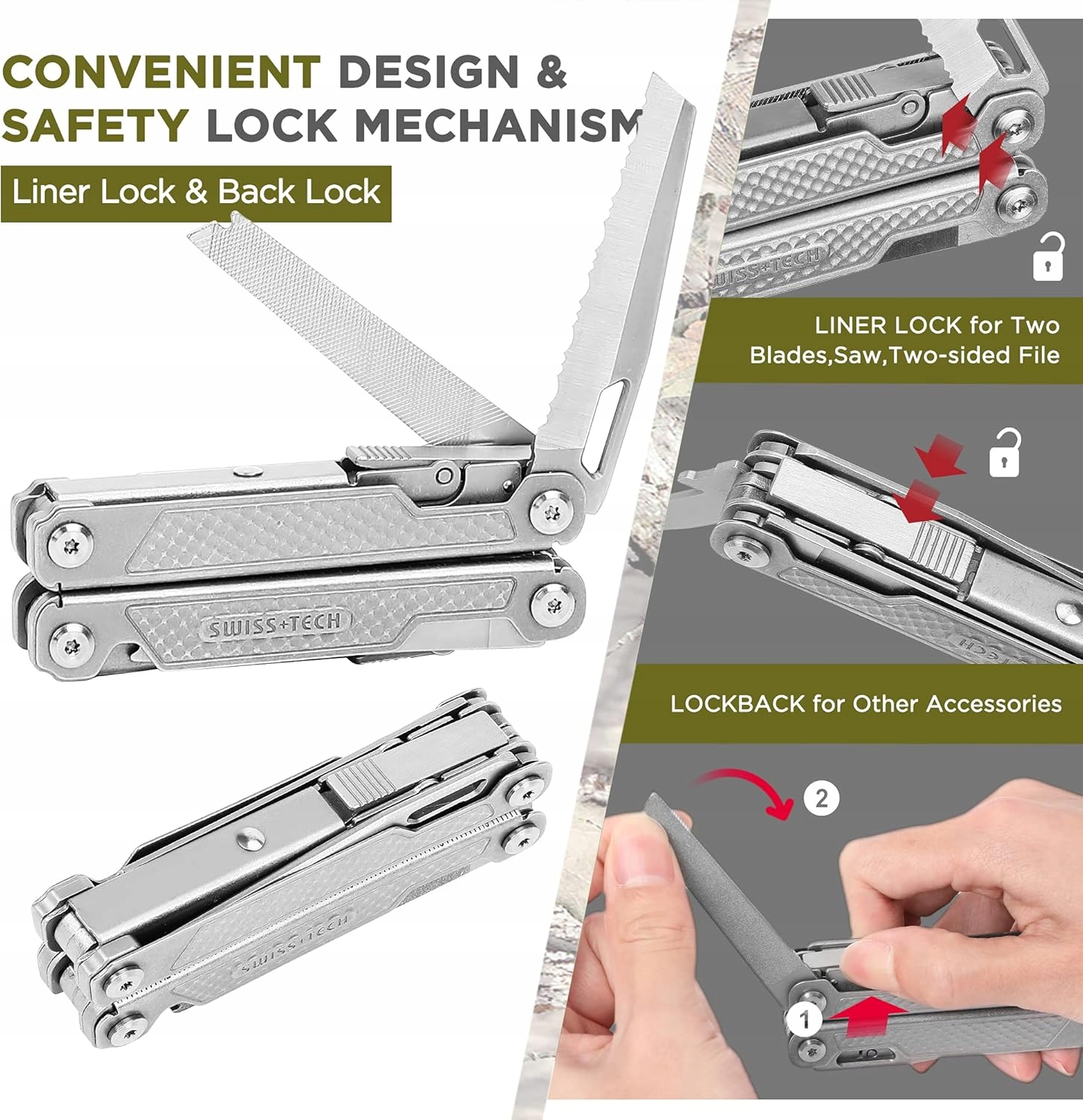 Высокое качество Swiss+Tech Многофункциональные плоскогубцы - идеальное решение для любителей DIY, выживания и ежедневного ремонта. Благодаря нержавеющей стали 3CR13 они чрезвычайно прочные, устойчивы к коррозии и износу. Компактный размер и эргономичная, не -сластичная ручка делает инструмент удобным для использования и простым в переносе.