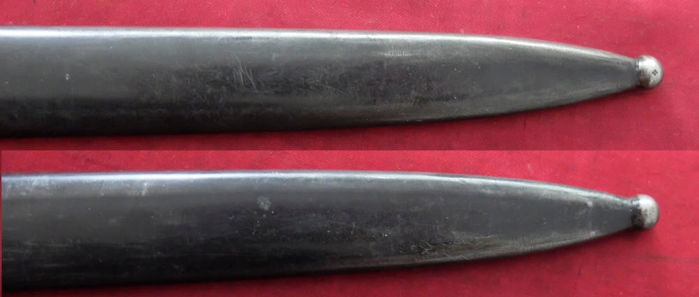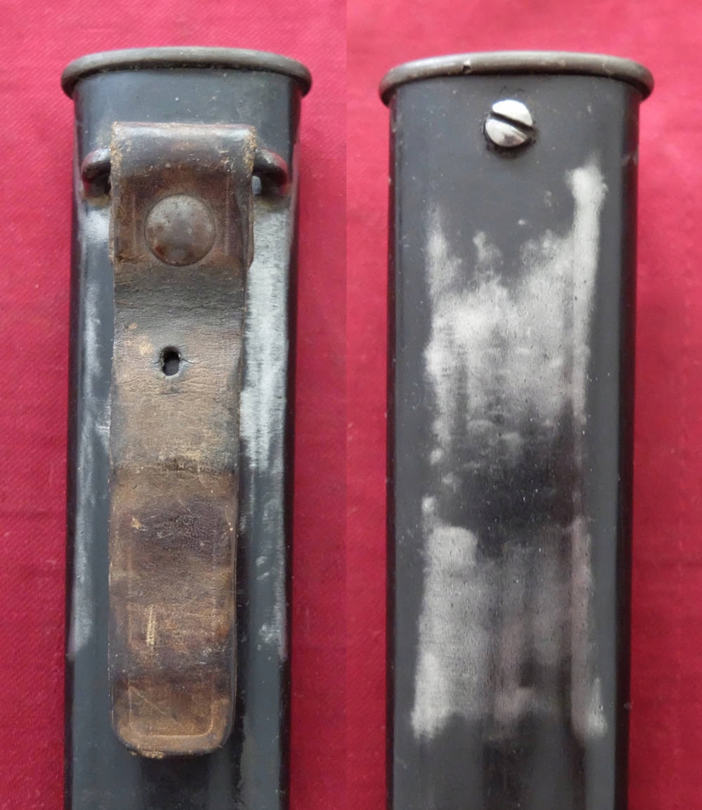 Ножны не имеют отверстий и частично сохранили первоначальную оксидную отделку. Направляющая ножен функциональна и хорошо удерживает клинок.