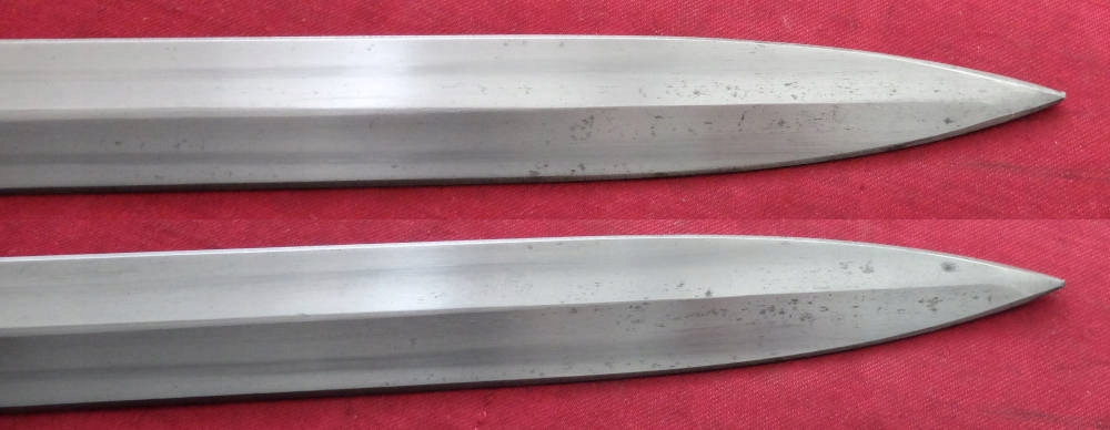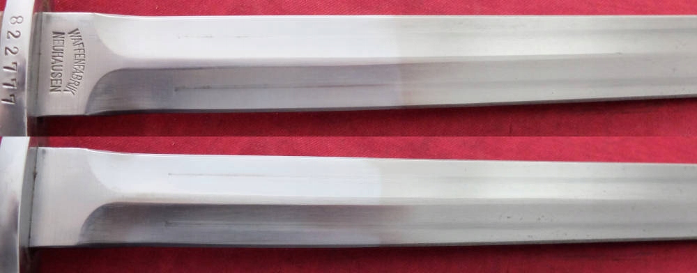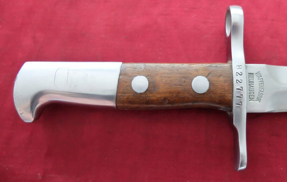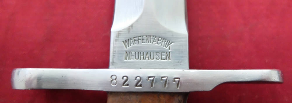 Экземпляр виден на фотографиях, очень хорошо сохранился. Лезвие не заточено, в отличном состоянии, заточено в заводских условиях, имеется след от направляющей ножен. На кромке клинка маркировка WAFFENFABRIK NEUHAUSEN. Накладки на ручки деревянные и оригинальные. Байонетный замок рабочий. На цевье выбит номер 822777.