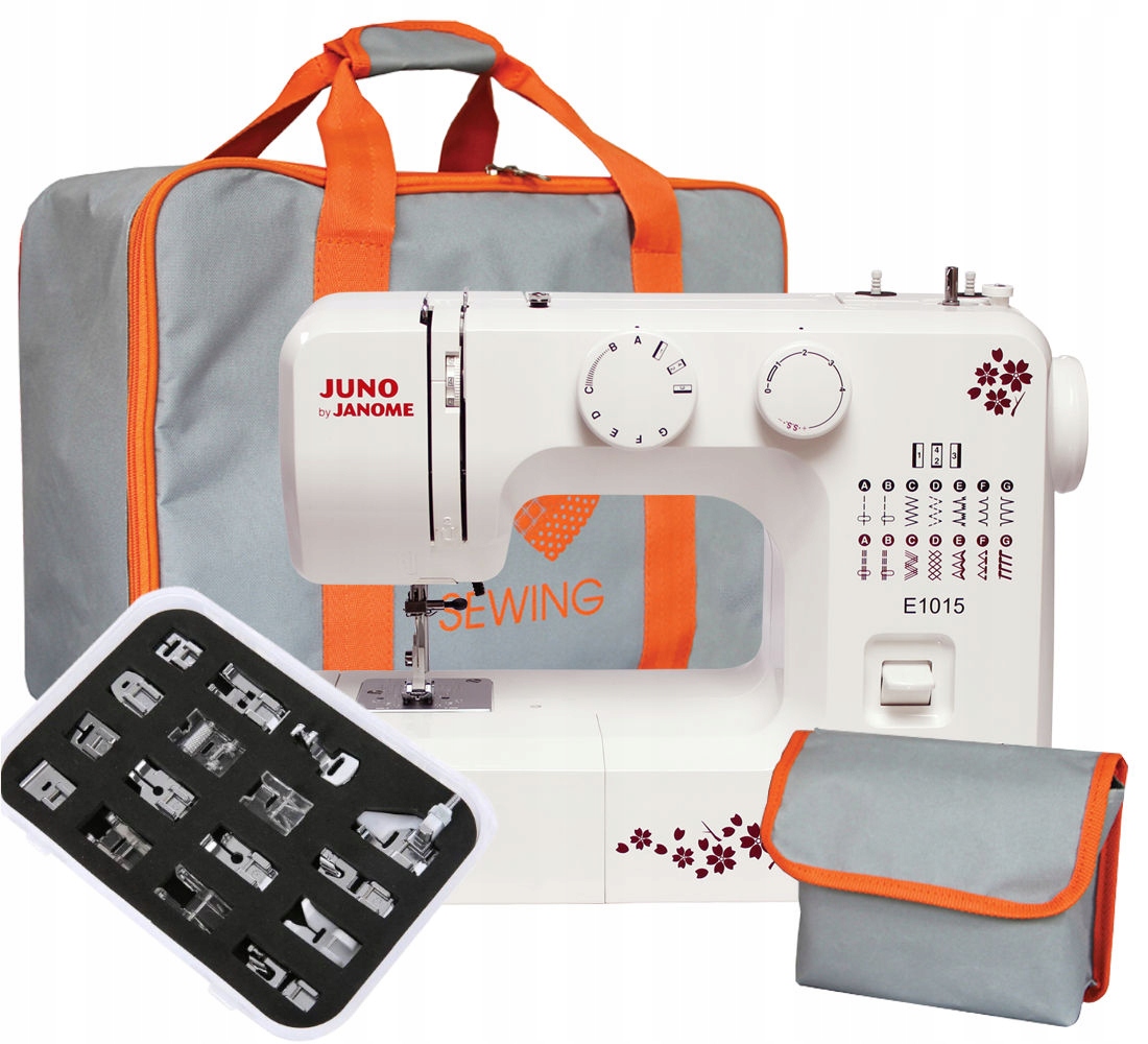 Швейная машина JANOME JUNO E1015 с сумкой, набором из 16 прижимных лапок и бесплатными подарками от нашей компании