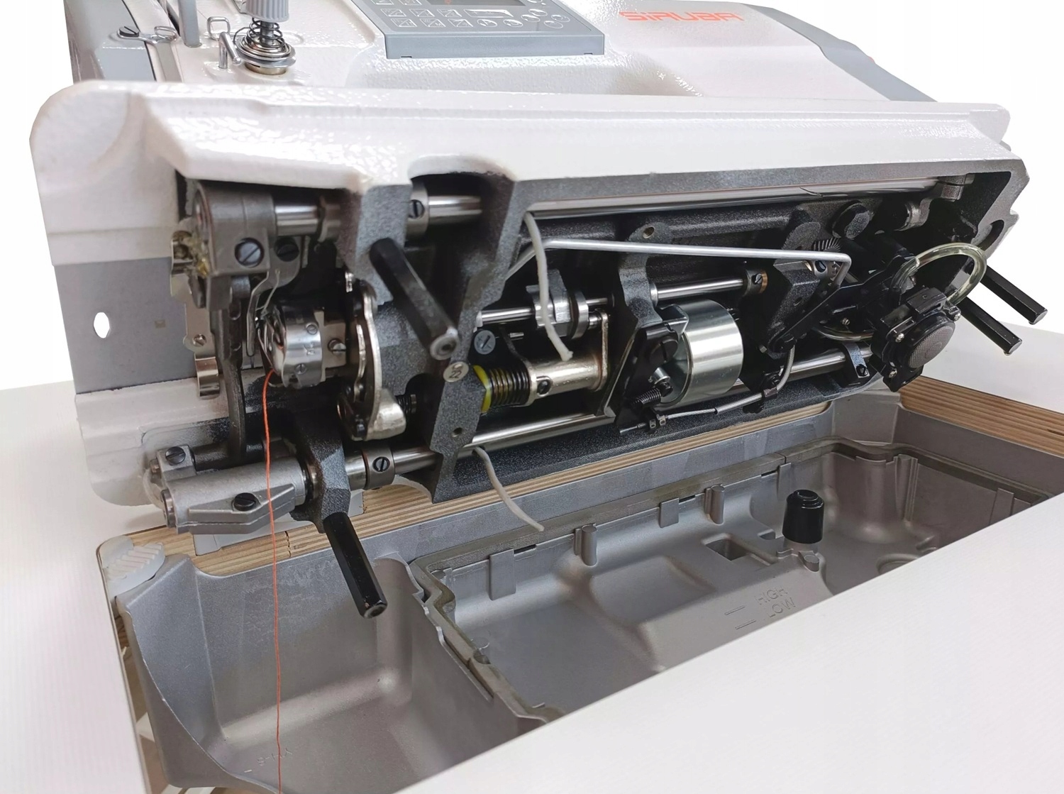 Модель Siruba DL720G-BH1 была оснащена современным двигателем прямого привода, встроенном непосредственно в голову машины. Эта конструкция устраняет необходимость использования приводного ремня, что приводит к более тихой и стабильной работе и ограничивает вибрации. Машина быстро реагирует на каждое движение педали, предлагая большую точность и лучше контролировать процесс шитья. Кроме того, этот тип диска потребляет меньше энергии, что делает его эффективным и экономичным выбором для профессиональных студий.