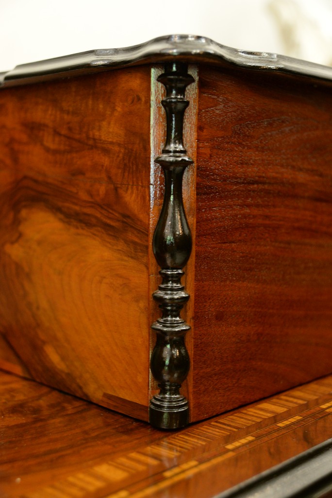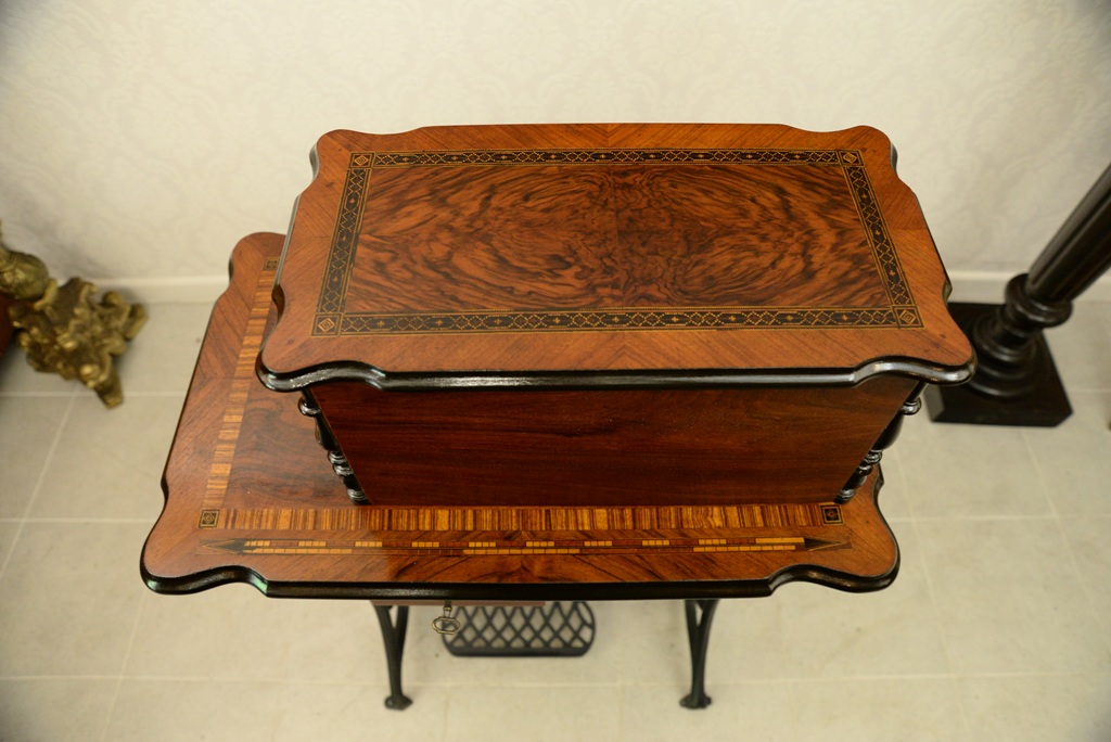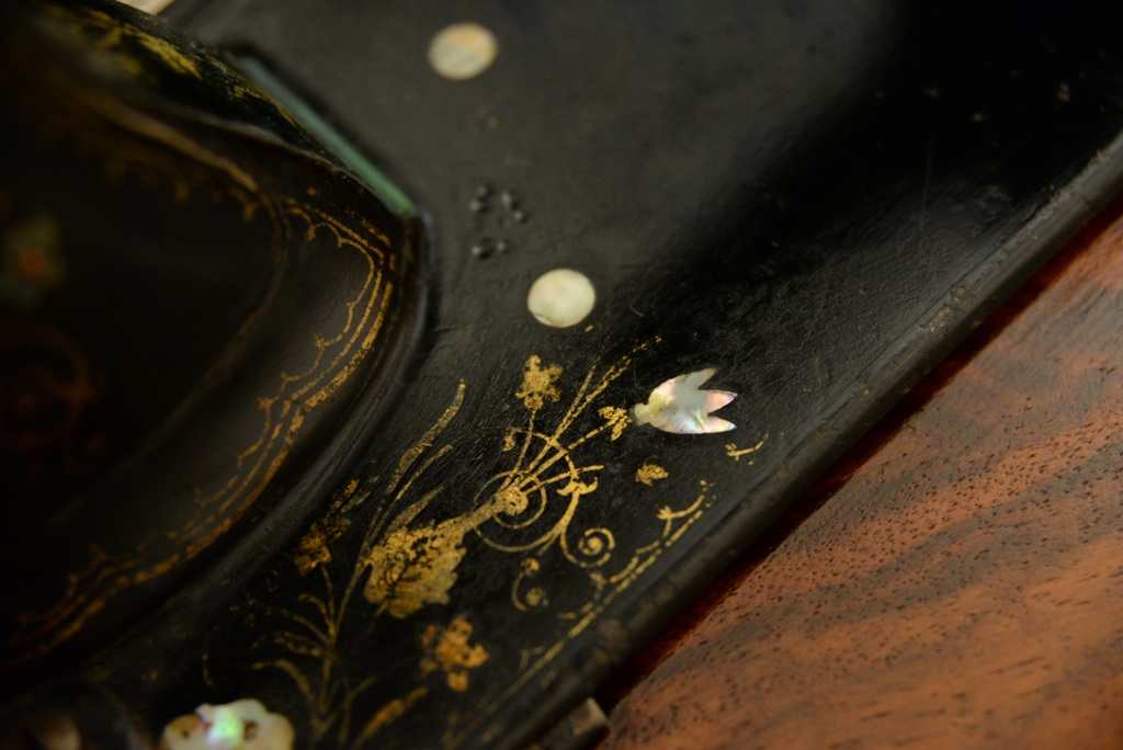 Машина очень богато украшена многочисленными инкрустациями как на столике, так и на крышке машины! И верх, и крышка украшены чернеными элементами – характерными резцами или полуколоннами! Сама машина украшена красивыми растительными рисунками с вставками перламутра, которые переливаются под разными углами!