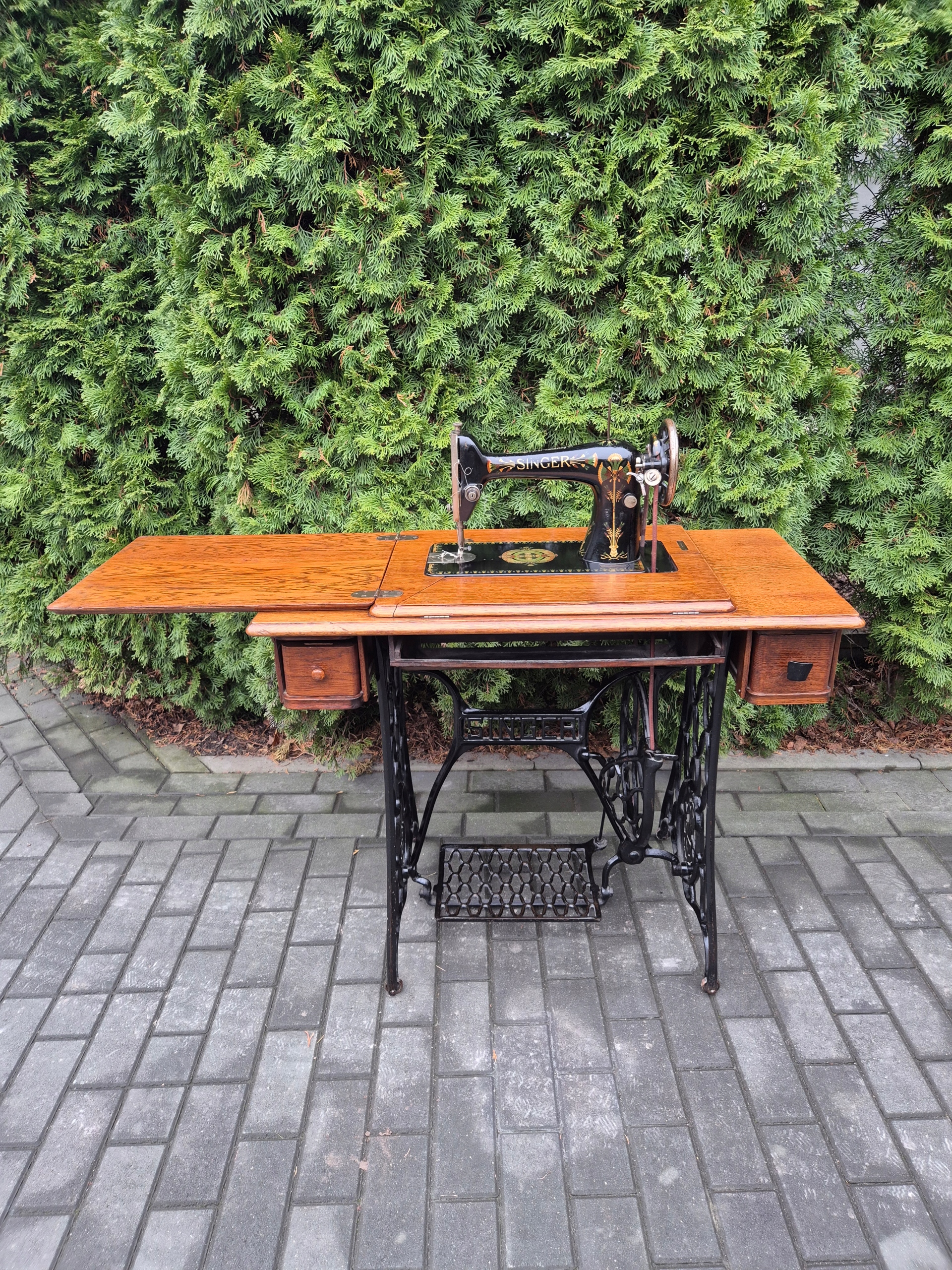 Оригинальная старинная швейная машина Singer с красивой заводской позолотой, установленная на деревянном столе с чугунной основой. Богато украшенная головка с классическим логотипом Singer и декоративная основа, сохранившаяся в аутентичном состоянии.