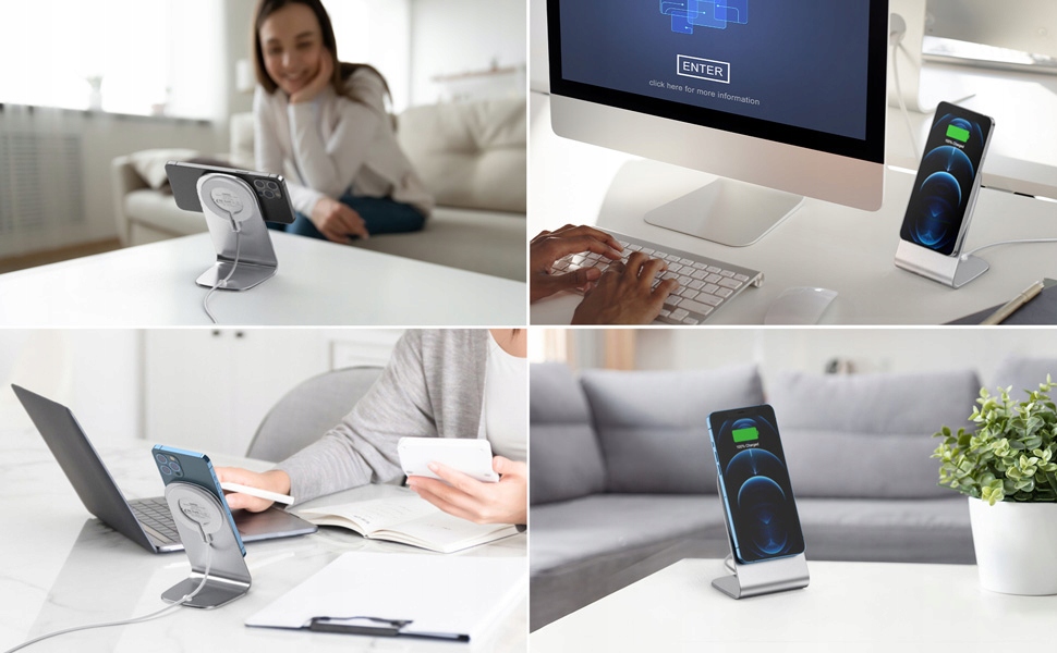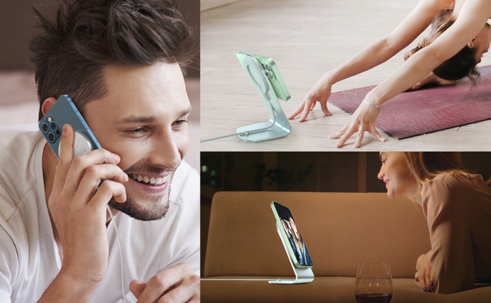 Важное примечание 1. Телефонные конверты не магсафе, такие как обложки Defender B. Otterbox. Чтобы получить лучший результат зарядки, мы рекомендуем Apple Case с Magsafe. 2. Зарядка подходит только для нашего беспроводного зарядного устройства (*** не для оригинального зарядного устройства Apple Mags или других брендов ***). 4. Мы используем сильный магнит для обеспечения оптимальной беспроводной зарядки. Чтобы удалить телефон со стойки зарядки, удерживайте подставку одной рукой и удалите телефон другой.
