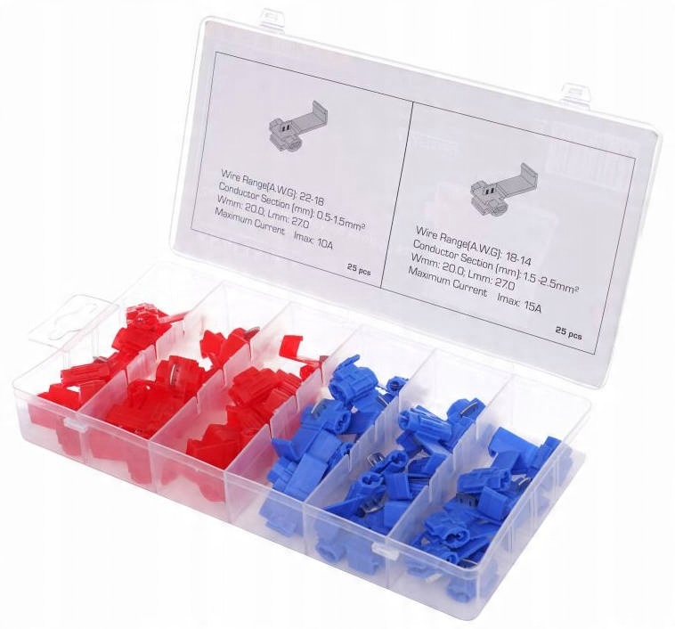 Профессиональный набор быстрого соединения для кабелей Kraft & Dele Model KD10481, предназначенного для подключения двух разделов кабелей низкого напряжения в электрической установке с использованием зажимов. Целое находится в исходном контейнере с отсеками.