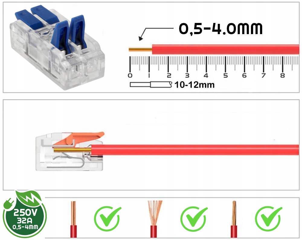 ✅ Двухсторонние, сквозные разъемы, предназначенные для соединения проводов от 0,5 до 4 мм и для использования с номинальным током 250В/32А