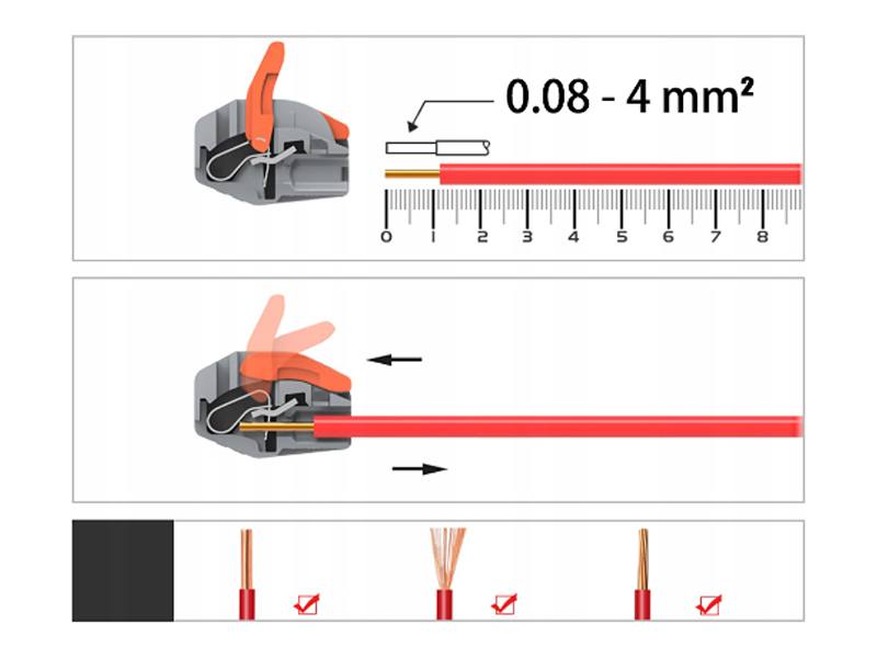 Quick Connector с рычагами высвобождения, предназначенным для соединения электрических кабелей с перекрестным разрешением от 0,08 мм до 4 мм