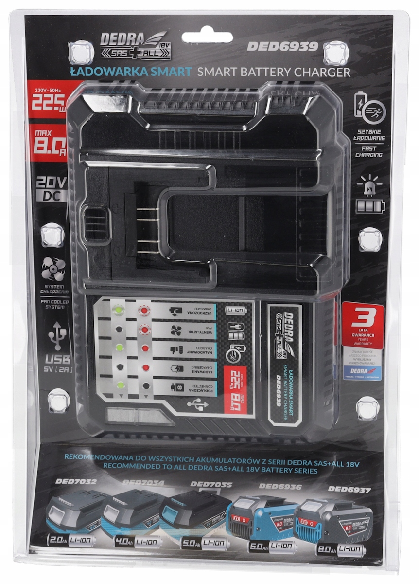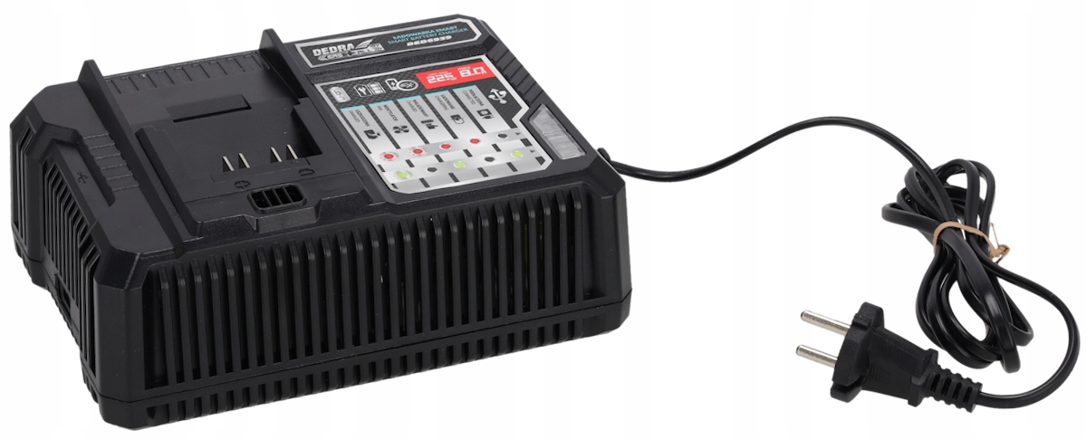 Это зарядное устройство SMART предназначено для зарядки аккумуляторов линейки DEDRA SAS+ALL (DED7032, DED7034, DED7035, DED6936, DED6937). Оснащенный вентилятором, он эффективно охлаждает батарею во время зарядки, что эффективно защищает элементы от перегрева и положительно влияет на срок службы батареи.
