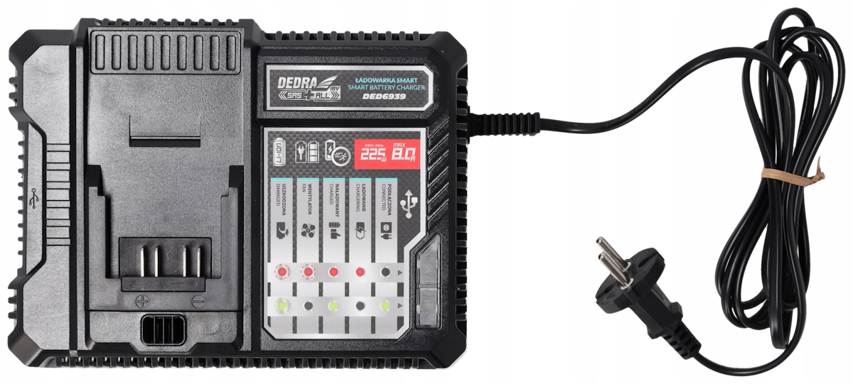 Быстрое зарядное устройство DEDRA SAS+ALL, напряжение 20 В, разъем USB 1x5 В/2 А, питание