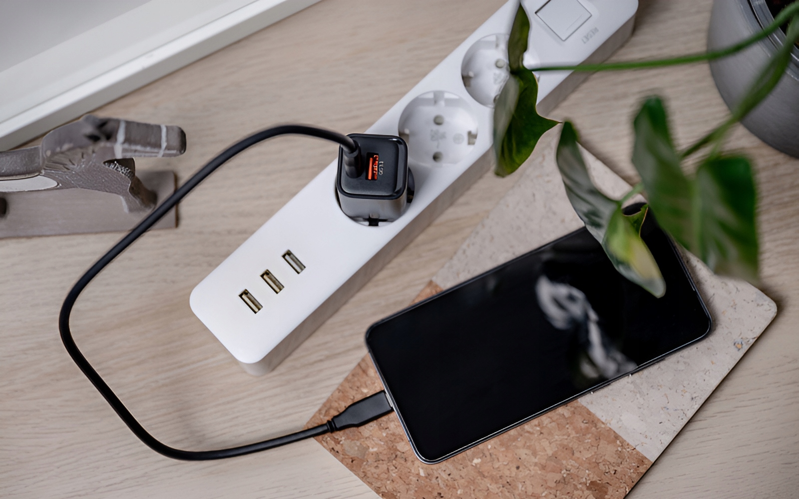 - Универсальное зарядное устройство с 1 портом USB-C и 1 портом USB-A.
