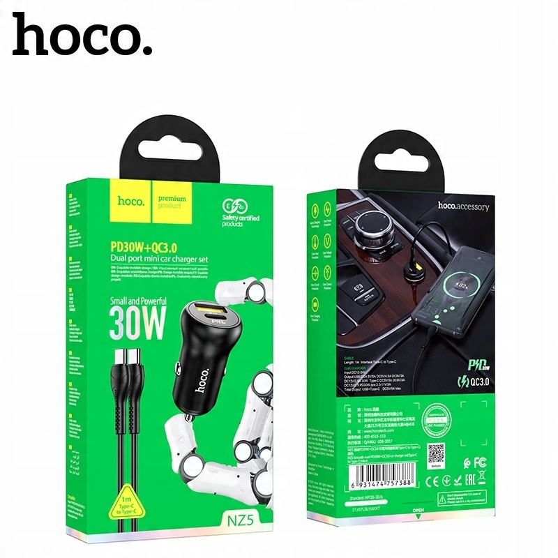 hoco NZ5 Smooth road — это минималистское автомобильное зарядное устройство с двумя портами USB: одним разъемом USB-A типа QC3.0/Quick Charge 3.0 мощностью 30 Вт, а другим разъемом USB Type-C/USB C Power Delivery. PD мощностью также 30 Вт, поддерживающий такие стандарты быстрой зарядки, как PD2.0/3.0, PPS, iPhone PD20W, QC3.0/QC2.0/Huawei FCP/SCP или Samsung AFC. Зарядное устройство дополнительно имеет все защиты по току и перенапряжению, а также сертификаты, разрешающие продажу и использование в Европейском Союзе. В комплект входит кабель USB Type-C/Type C/Type C PD длиной 1 м/100 см.