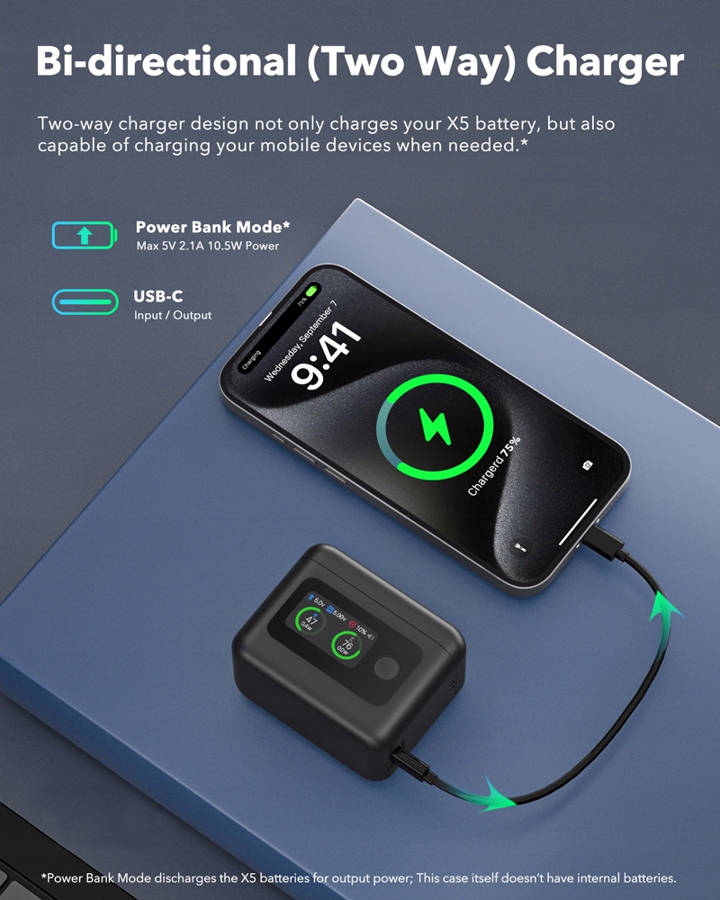 Функция двунаправленного источника питания: разряжайте накопленную энергию аккумулятора X5 через 10-ваттный выход USB-C W для зарядки телефонов или устройств, когда это необходимо, идеально подходит для в чрезвычайных ситуациях или в дороге.