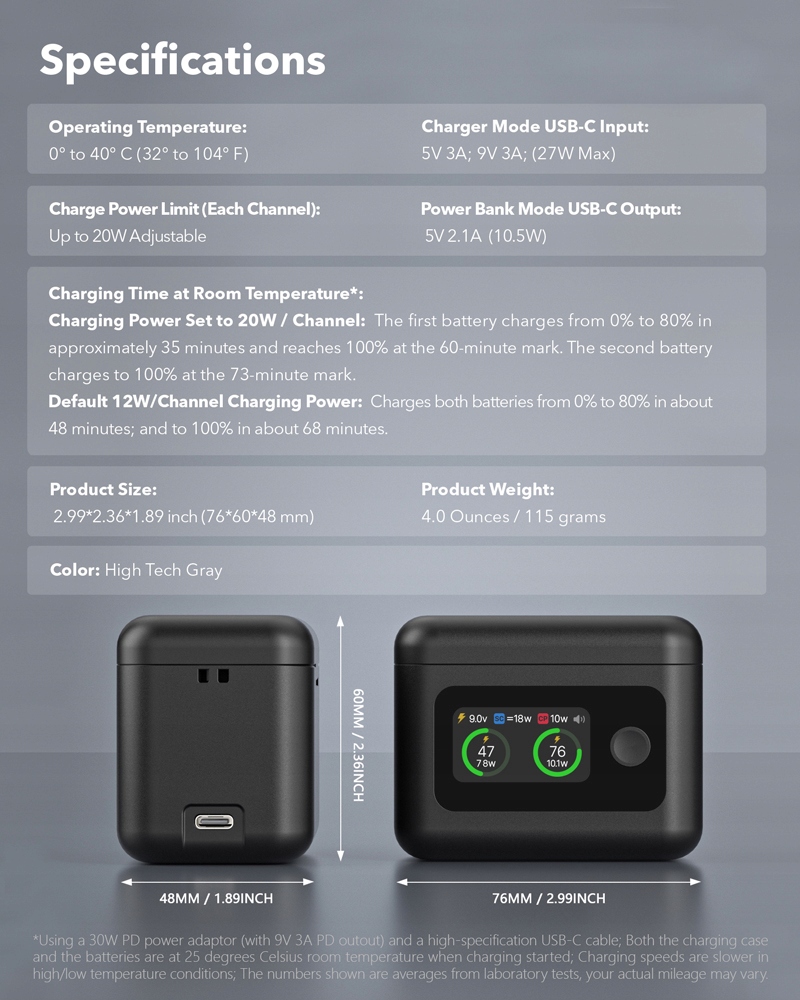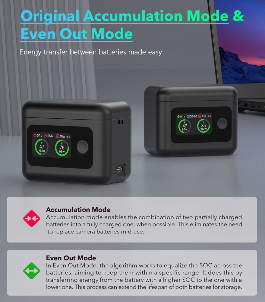 Режимы оптимизации батареи: по возможности объединяйте частичную зарядку в полную батарею (режим накопления), что позволяет избежать необходимости заменять батарею во время использования. Или сбалансируйте уровни заряда (режим Even Out), чтобы максимально увеличить срок службы и безопасность хранения. Точно соответствует оригинальным профилям зарядки; Защищает состояние батареи с помощью температурной защиты (высокой/низкой) для безопасного управления питанием.