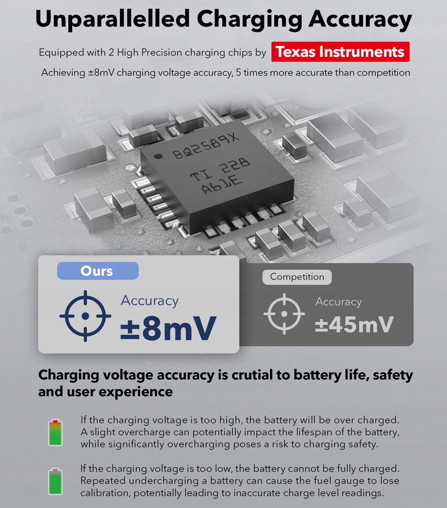 Непревзойденная точность зарядки: оснащен высокоточными микросхемами управления зарядом Texas Instruments, обеспечивающими точность ±8 мВ (по сравнению с типичной погрешностью других производителей -45 мВ), а также поканальную калибровку для устранения риска чрезмерной или недостаточной зарядки.
