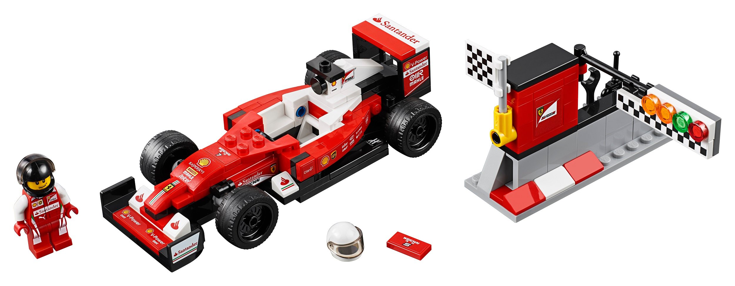 - Модель Scuderia ferrari SF16-H, чтобы построить слезы на трассе! Этот автомобиль имеет кабину с местом для минифигуры, колесами с резиновыми шинами и двумя заменяемыми стартовыми номерами. Для этого он украшен наклейками в стиле гонок и имеет ряд деталей, которые повышают его подлинность.