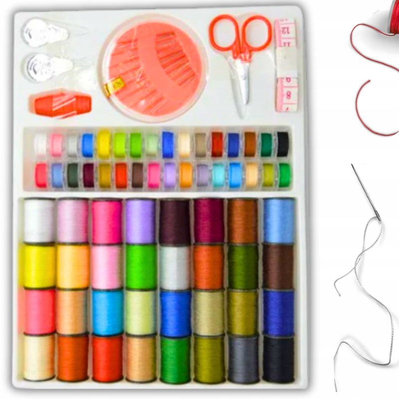 - В нашем наборе 32 большие и 32 маленькие катушки ниток разных цветов, коробка с иглами разных размеров, 2 наперстка, 1 сантиметр, 1 ножницы, 1 нитевдеватель и 1 вспарыватель - все, что вам нужно, чтобы сделать ваши швейные проекты еще проще и приятнее.