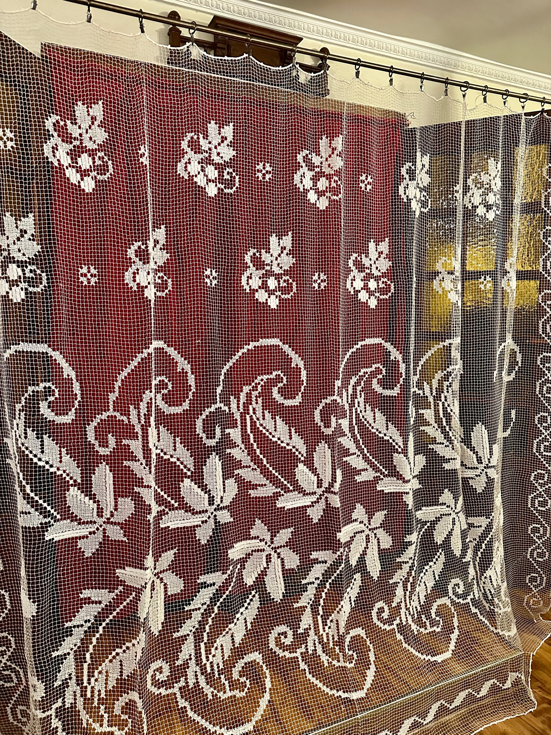 Исключительно красивая штора, выполненная вручную в филейной технике (вышивка по сетке). Несмотря на время, он находится в очень хорошем состоянии. Сетка из синтетического шнура, расшитая хлопковыми нитками. Цвет экрю. На последней фотографии видно несколько неравномерно завязанных стежков.
